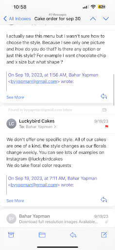 Besides her incredible skills as a baker, Amy is also a lovely person to work with. Throughout the entire process, she was friendly, communicative, and kind. She was quick to answer my questions and super professional. If we ever throw another special event and need a cake, I will 100% reach out to Luckybird! In fact, I’m really trying to find a reason to order a second wedding cake, just for myself THANK...