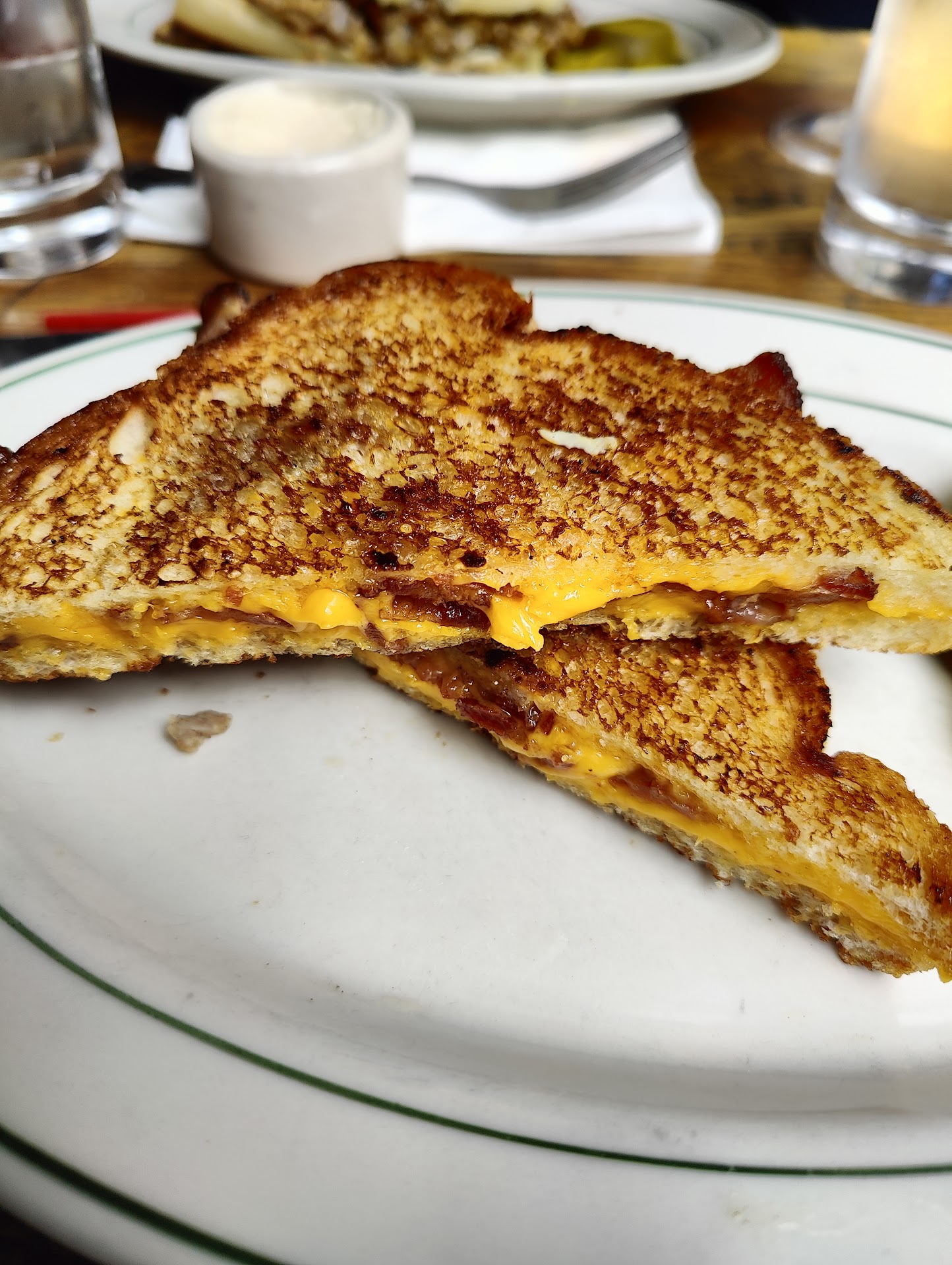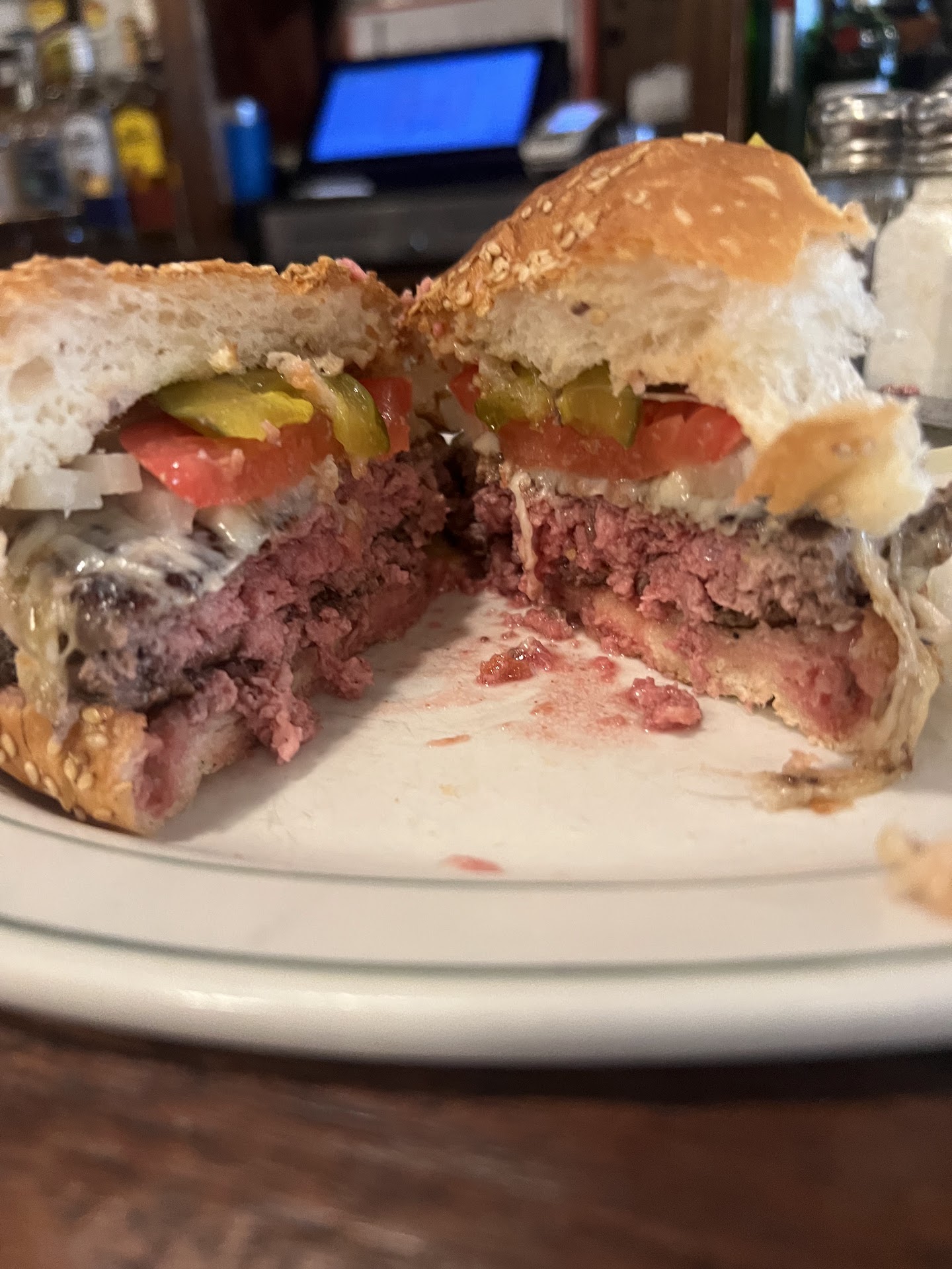 The only real complaint I had is that the people on either side of me were regulars or worked there and both sat at the bar after being outside smoking cigarettes and it killed the meal for me. I don’t want to smell cigarettes while I’m eating. Burger was...