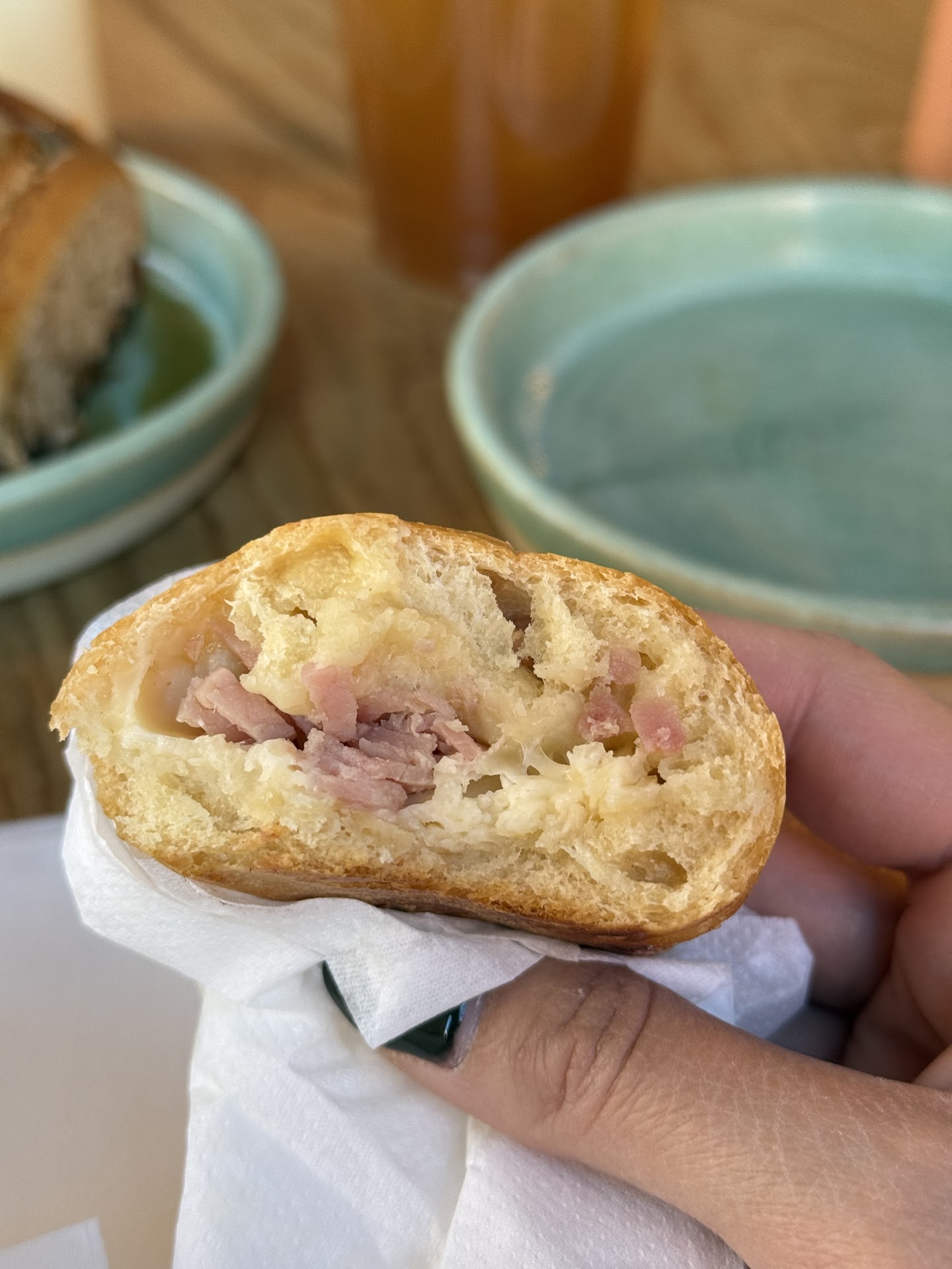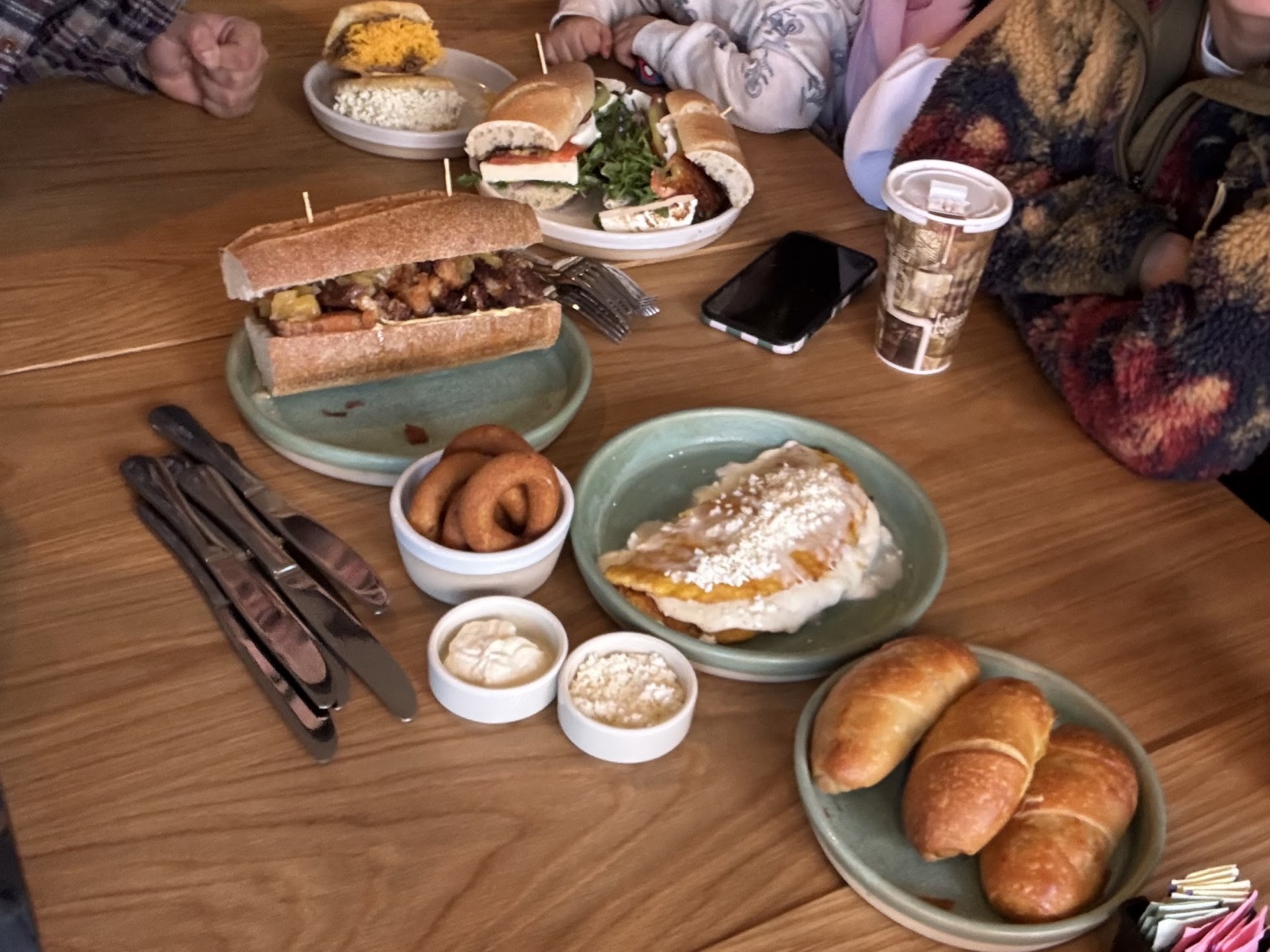 We got two matchas, three coffees (Americano, one with milk, and a drip), and a toddy (which was very sweet but fine). For food, we had two fried arepas (beef and chicken), two grilled arepas, a cachapa, four ham and cheese cachitos, a canilla sandwich, a campesino sandwich, the Lulla’s Club, and French toast.