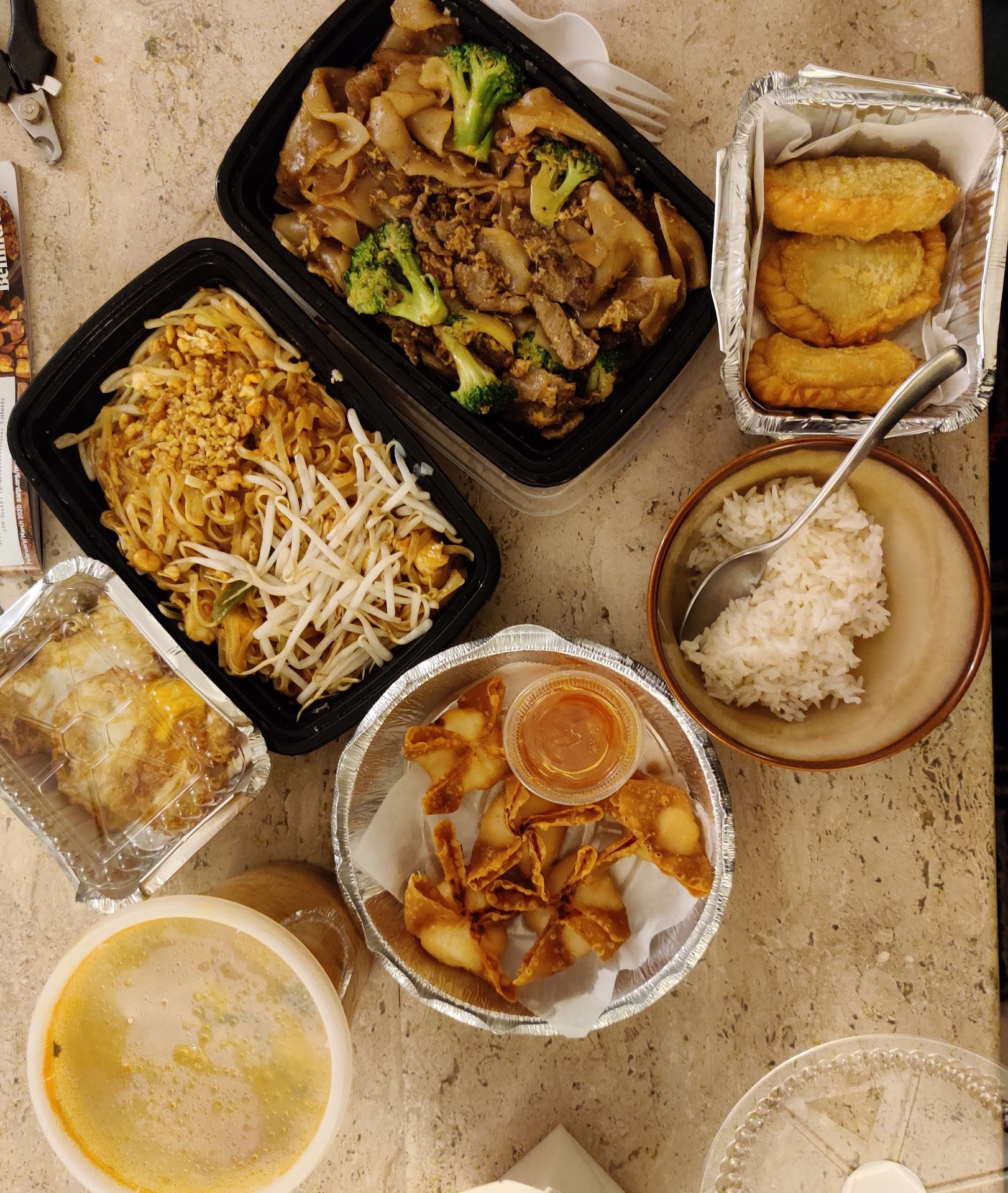 Because of the COVID-19 quarantine, delivery was our only option :/ still the portions were huge and the price comparable to what I received. Curry puffs, chicken pad Thai, beef red curry, beef pad see ew, and the cheese and crab wontons all hit the right spot for this hungry crew. We will visit you in...