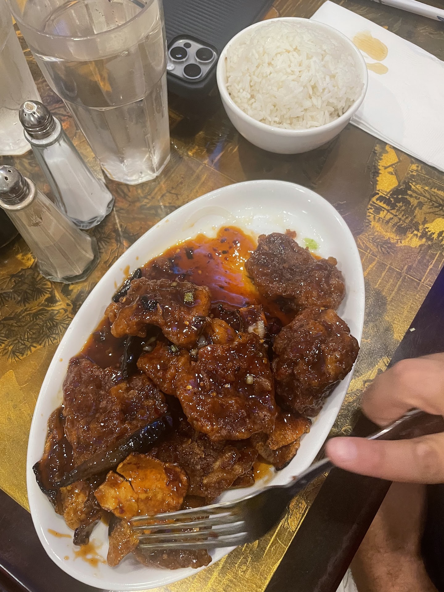 Read moreThis place offers large portions to eat when you’re super hungry! My husband got the orange beef/chicken and it was amazing!!! We saw several people order the orange chicken, so it seems like a favorite. Comes with a side of broccoli and white rice and we would definitely request this again. I tried the chicken lo mein and while it was delicious, I would’ve preferred to have more veggies in it. The noodles were really great though, not too mushy, and a great salty taste. The fried pork dumplings and wontons were yummy and would recommend to share amongst 2-4 people. My friend ordered the spicy chicken Pad Thai here and it was a bit more mushy than she would’ve liked, so just an FYI for those who don’t like that. The service was great and after a whole day of sight seeing and walking, this sure did make us super full. For those who cannot eat with chopsticks, this was one of the few grade A Chinese places that offered plates with a spoon and fork directly...