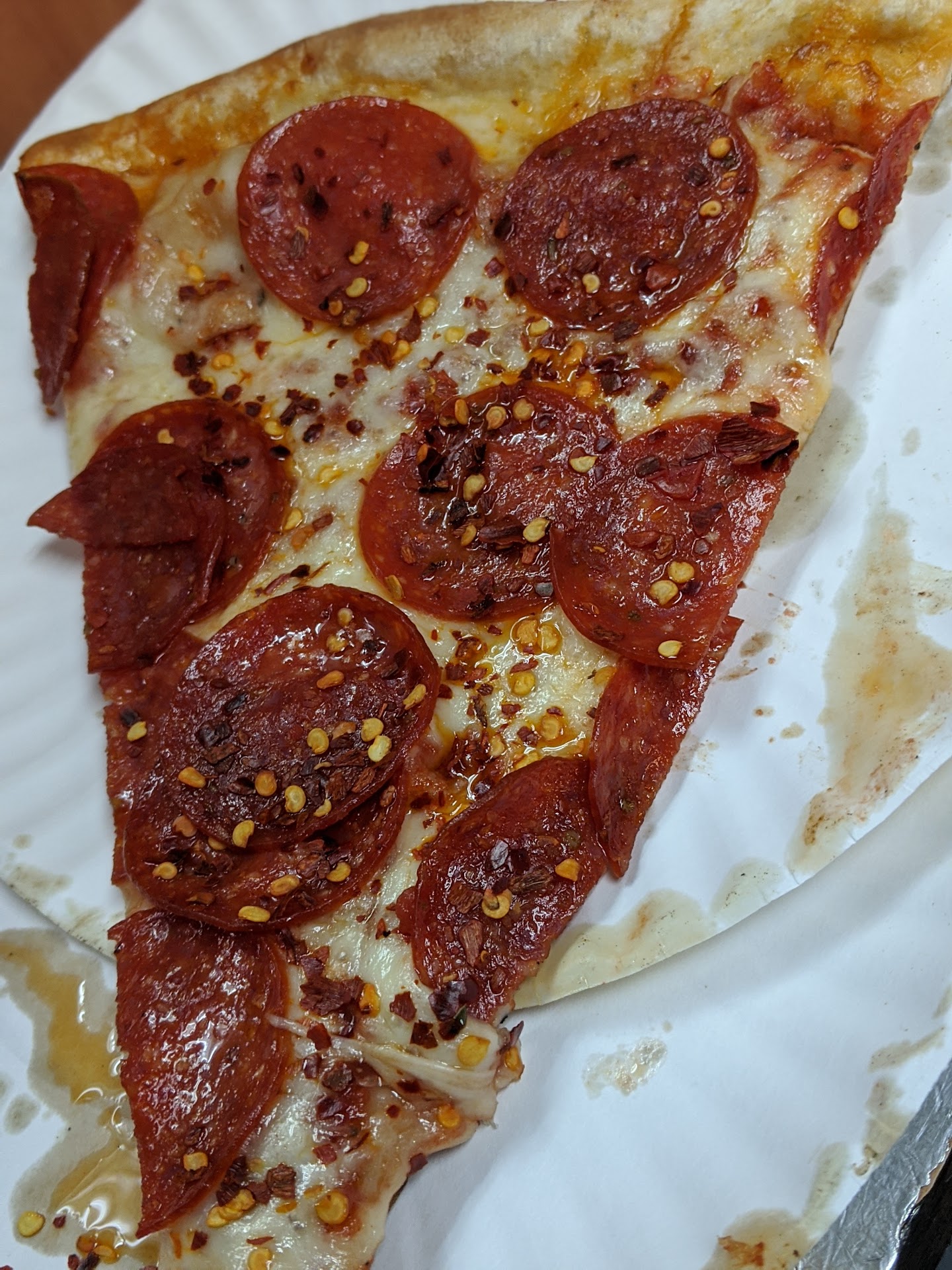 Read moreI expected a different flavor, something that said New York, crust, sauce, something...just wasn't there. This was simply a large slice of pizza you can get from any pizza joint. It has decent reviews but definitely nothing to write home about! I had a beef/tomato something and wife had meat lovers. Mine was barely warm from their oven. The garlic knots were ok at best...definitely had better. Most definitely an average place. Obviously from the reviews, other people have had better experiences...I definitely...