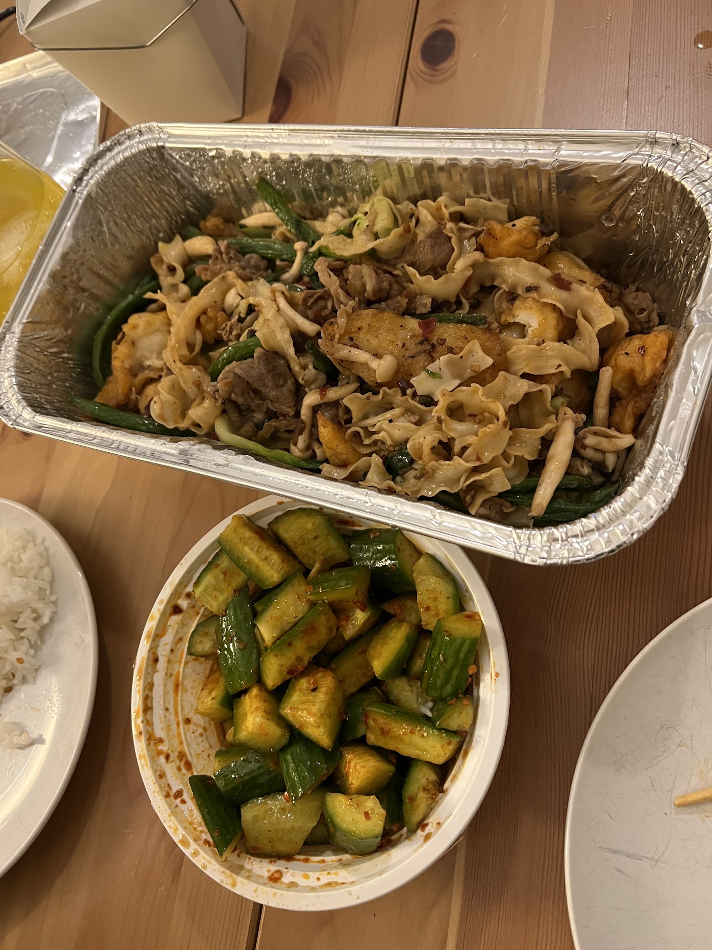 You can never go wrong with the spicy garlic cucumber appetizer and in the dry hot pot get the thing slice beef, fish, enoki mushrooms, cilantro, ribbon noodles, and a veggie like bok choy. You can choose your spice level and for those who have never had northern Szechuan food before: beware the pepper corn. This is a unique type of spice that you may have to grow to love and once you do there’s no going back!