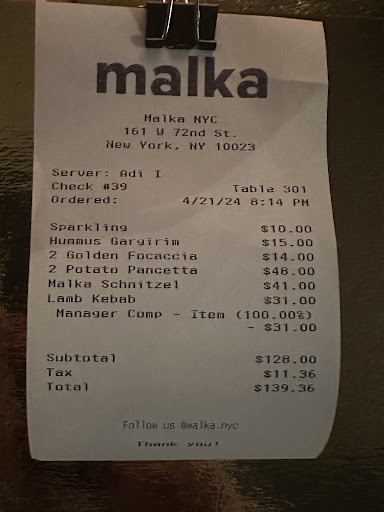 In conclusion, the experience at Malka was a mix of minor successes overshadowed by several missteps. From the inconsistent service at the start to the underwhelming presentation and ambiance, it was a night that stood out more for its flaws than its culinary achievements. My overall rating for Malka remains a 2.5 out of 5, reflecting a dining experience that could benefit greatly from more attention to detail in both service and...
