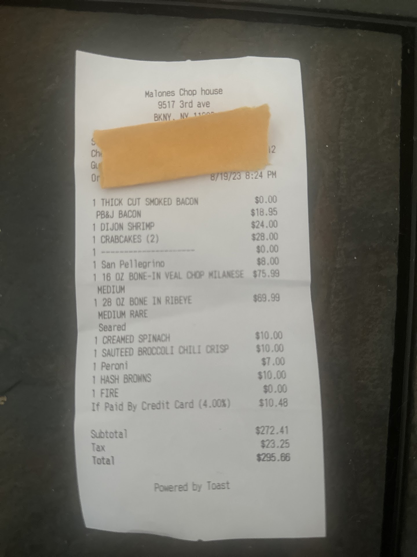 Read moreThe place advertises itself as an”old school steakhouse” unfortunately it does not have that fell at all. It feel like a modern day burger joint with the lights and disco ball and a TV in the dining room!!!! For a second i wasn’t sure if this was a stake houce or just a bar. We were sat 20 min past our reservation time which is fine, new place in the neighborhood they were packed! The table where we were sat, the floor had a slant so the whole time i felt like i was sitting in a handicap ramp sliding to my left. The food is very very good BUT you will need to order and try as you go because staff is very uneducated in regards to the menu, anything that we picked from the menu and had a question on was either not available or the server had to go and ask the manager. Many things were not available. I ask for a wine list, i was told they do not have one but will get back to me and let me know that they have, never came back. We had to ask several different staff member for different things as out waiter/waitress was not really paying attention to us. It was apparent the dinning room staff was weak and unprofessional, meaning when i spend $$$ i expect a little more then what we got as far as service goes. Not going to lie the service was beyond disappointing, but we will be back to give it another try in few months hopefully they have it figured out by then. I definitely recommend it as the food really was good at least most of it. They charge 4% if you pay with a credit card which means they actually make $ off you using a credit card (standard merchant service fee is 2.95%) - i didn’t appreciate that as it was not mentioned by anyone nor did it say it in the menu which its should according to the state. Receipt is attached to this, dinner for 2 i tipped $60 on top of what you see even thou they didnt deserve it but everyone needs to make a living...