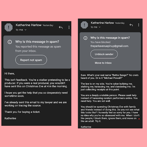 This review is in regards to the "Powderpuff Peep Show" booked by "The Park Avenue Pinup" aka "Katherine Harlow", Katherine McMahon. I attended the burlesque show with my husband a couple of weeks ago to scout for new talent since my husband and I produce shows for other venues. I thought it was strange the ad for the show stated to bring cash to tip performers, since tipping at a $20/ticket burlesque show is optional and no legitimate shows would put this on the ad since people that want to tip, always do tip. The lineup repeatedly changed and less dancers appeared than what was advertised, yet the cost of the show was the same. Genie Adagio was by far the best performer and Katherine, the one that "produced" the show was by far the worst, missing the mark considerably on her performance. From her inability to keep on time with the music, lack of understanding on what to do with feather fans, stiff and few movements besides walking back and forth, and failing to do any actual production, it was clear she's new to burlesque. I checked her website and she wrote she was "trained by legends of burlesque" yet doesn't name a single person she's trained under or even a class she took. She also said she was a professional in the industry and her GigSalad profile shows she's attempting to charge between $300-$1500 per performance. Not only did she list her email, but she provided a Cashapp, PayPal, and Venmo username as if people are supposed to send her money prior to performing. It's extremely tacky for any performer to post these payment app usernames on their website. I sent her an email that I had seen the show and provided the tips mentioned above. She sent an unprofessional email back and told me to keep my "opinion" (feedback) to myself. She also said I was "harrassing and stalking" her since I sent my feedback to an email she posted on her website. She ended with a snarky comment hoping I "heal"... from apparently giving feedback. She followed up with an email saying her lawyer would be "tracing the source of my email", along with another message reiterating my need to "heal", and even took the time to research my husband's first name. I hope Marian's reconsiders having Katherine continue to book burlesque shows while ripping off customers (and providing a rude response and looking up my husband's name in response to honest feedback) by having fewer performers than advertised for the same ticket cost. This show is giving a bad name...