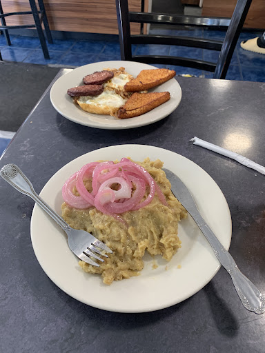 I had the mangú con los tres golpes for breakfast, recommended by someone else’s review here. The portion, including passion fruit juice, was absolutely huge, and it only set me back $14.
