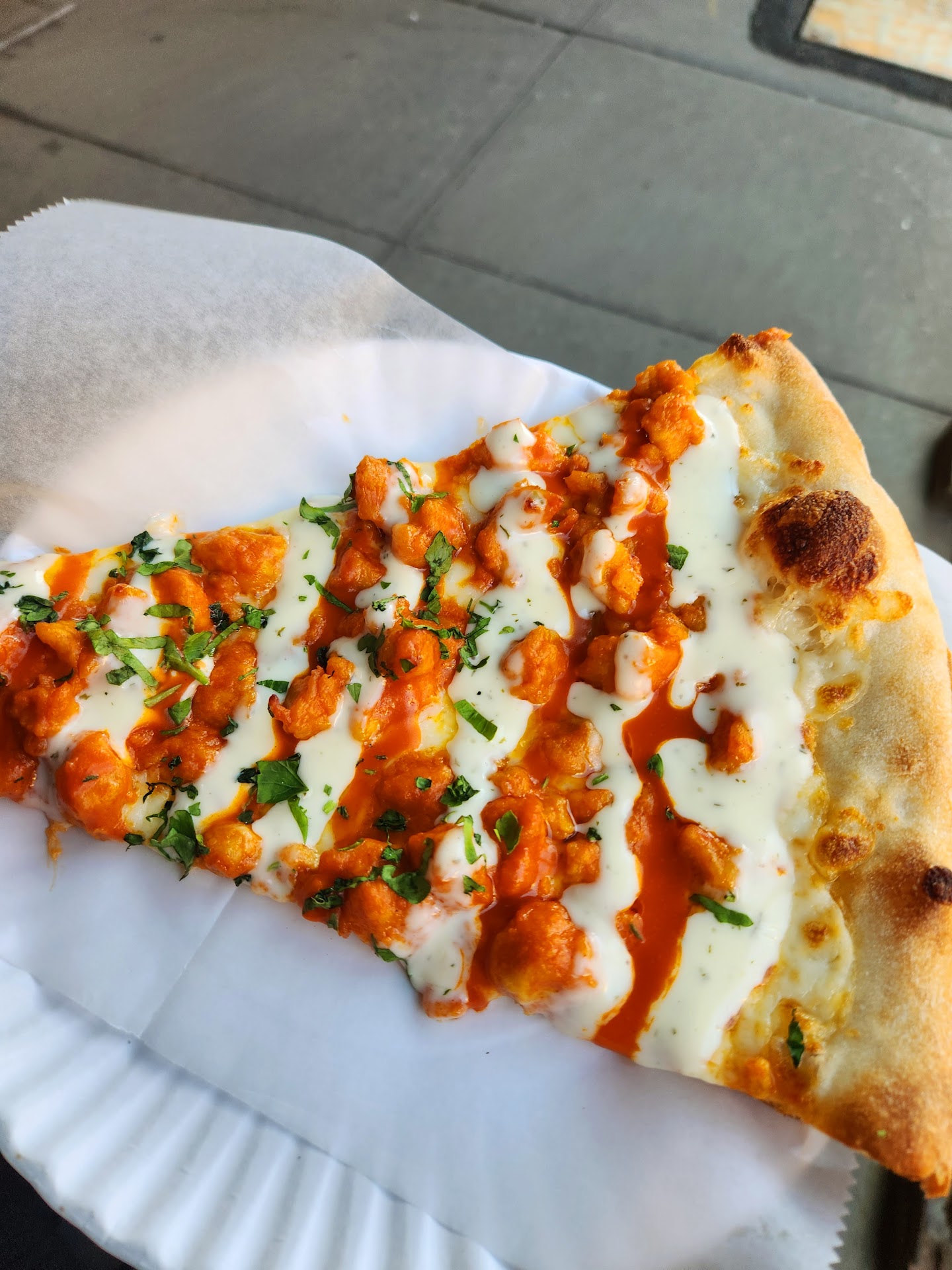 Read moreThe Buffalo Chicken slice this pizzeria serves is pretty much one of the best slices I've had in Manhattan. Juicy, crunchy with the right amount of sauce and cheese, this pizza is sure to melt any pizza lover's heart. This is not your usual slimey and grimey pizza shop with walls covered with black goo. The place is tastefully decorated, is neat, and always kept tidy. Also, they have air conditioning, so you can have a seat and enjoy your slice. Lunch hour is very busy, and finding seating during rush hours, however, is not easy. They have outdoor seating as well. Staff is courteous, and service is quick. Very often, you will find someone taking your order while you're on line, and the food will be ready by the time you reach the register. I love it how quick the line moves. Highly...