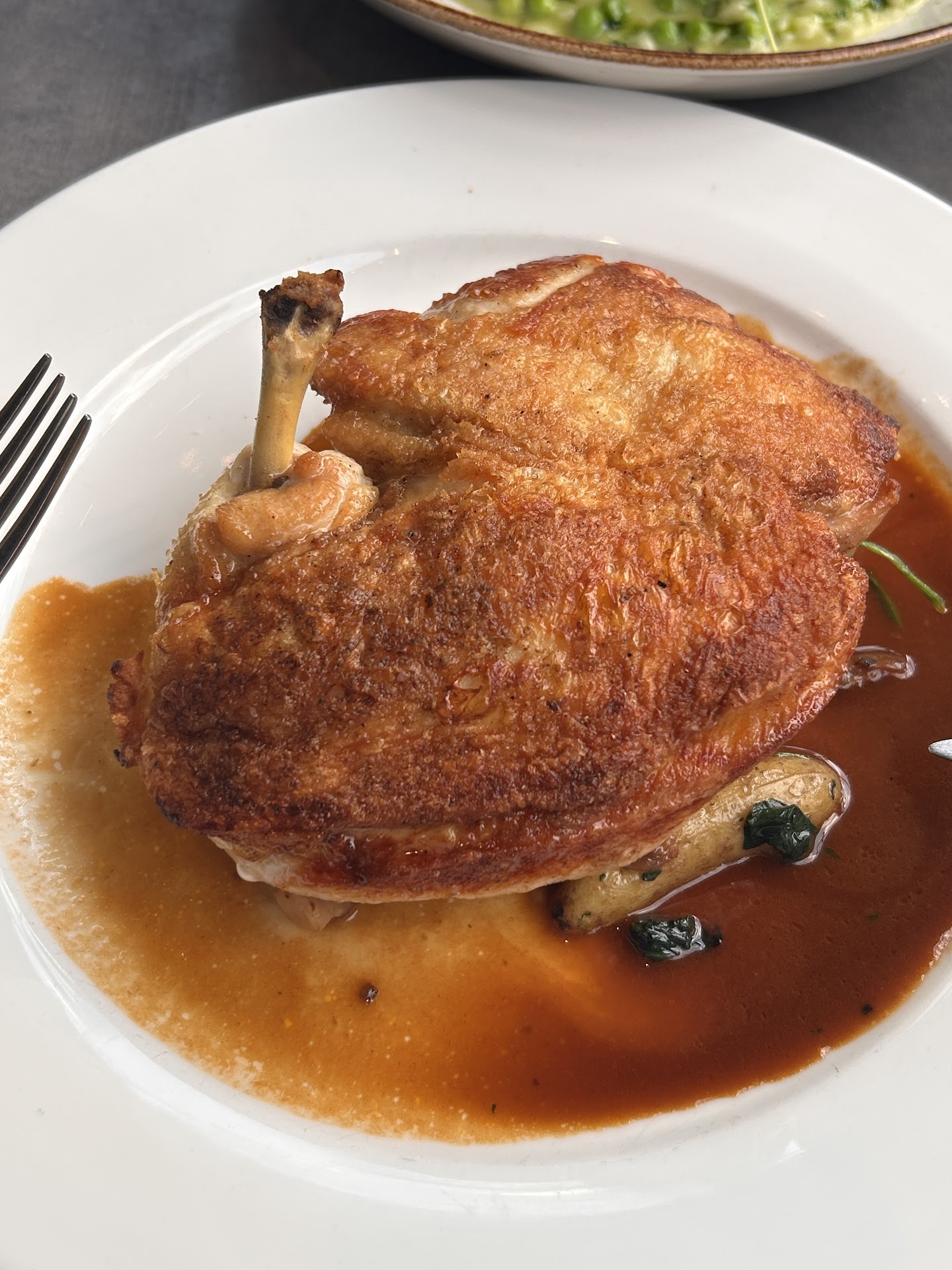 For our main courses, we ordered the crispy chicken and the roasted halibut. The chicken dish was overall a hitâcrispy skin, tender and juicy meatâbut it fell short on seasoning. A touch more salt would have elevated it from good to exceptional. The halibut came with an artful presentation, nestled among vibrant peas, but unfortunately, the flavor didnât match the visuals. It was a bit bland and underwhelming despite its polished appearance.