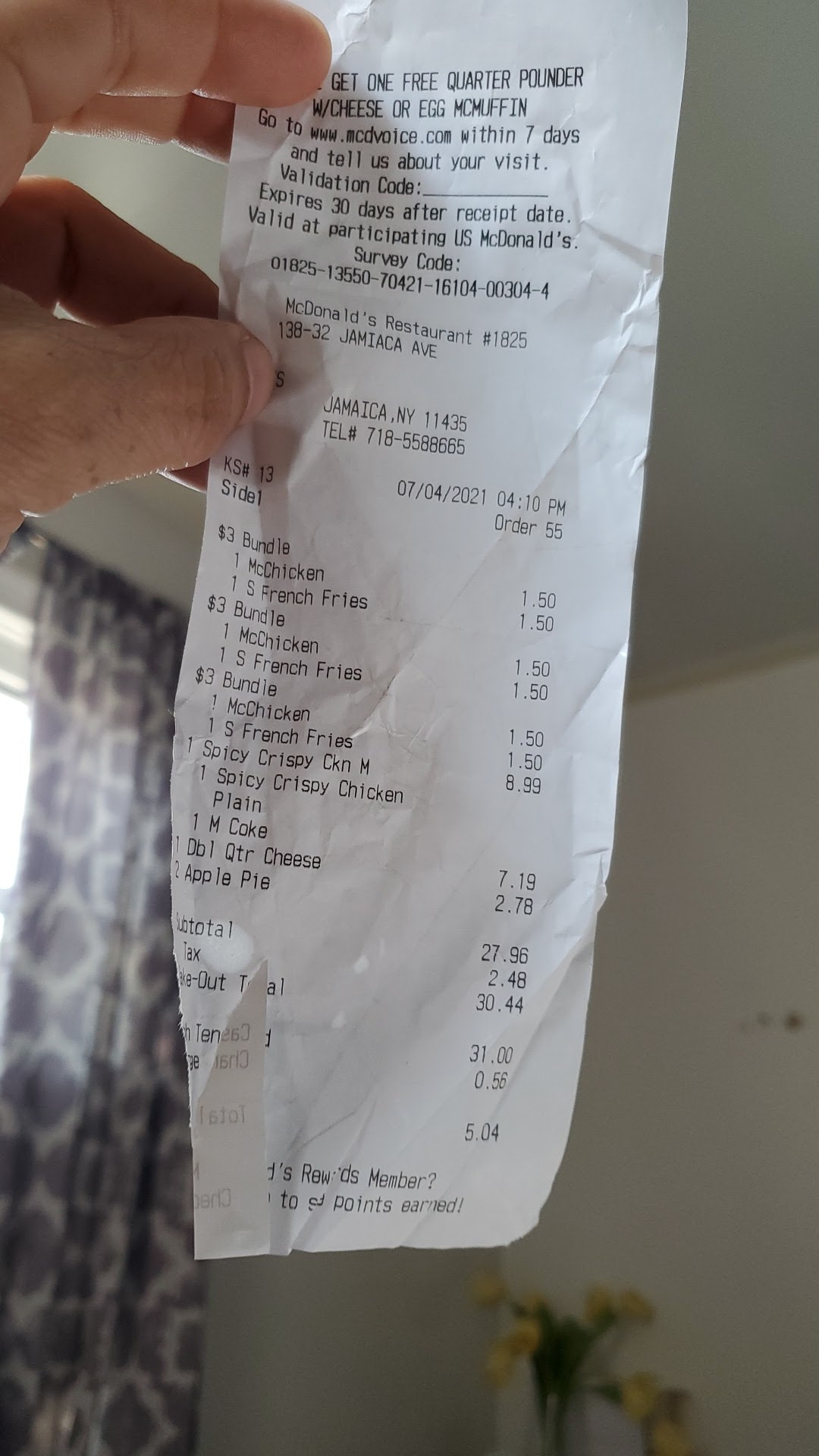 Read moreNow I'm a very fair guy and out of so many reviews I have done I never complain about service but this was by far one of the worst experiences I have ever had. So running late I purchased a medium fries from a coupon I won. I ran down the block to my doctor's appointment only to find hair in my fries. I toss then out and return to mcdonalds with the receipt and the packaging to tell them that there was hair and I woikd like another side of it. The manager comes out won will post a pic automatically refuses me and would not let me explain. I showed him the receipt and he wanted me to go pick up the fries from the floor and bring them in the store to show him. I was embarrassed. He refused to give me his name nor the number of the store to file a complaint. All receipts the ink was fading for the store number. He then grabbed the review out of my hand and refused me any service. I am going to file a complaint and actually call corporate on him. It was embarrassing as everyone was starting at us as we get in a yelling match. By far the worst experiences and finally he told me he's denying me the fries because I won them from prize instead of paying cash. I was forced to show him my wallet full of money to prove to him that I'm a worker(engineering) btw to let him know it wasnt the money that was the issue but the service and disrespectful environment he allows as a manager. Horrible if I can give them a 0 I would have. Worst experiences. Did not...