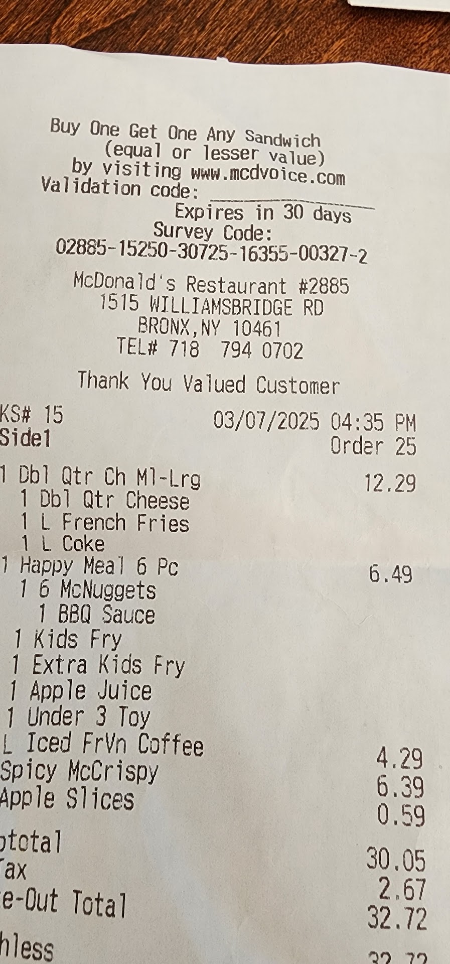 Read moreThe food at the McDonald's on the corner of Williamsbridge and Silver Street in Bronx, NY, is okay but served promptly, however the cookie and pastry trays are left out in the open when they should be covered up prior to baking.