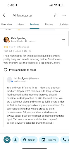 Original: I had high hopes for this place because it’s always pretty busy and smells amazing inside. Service was very friendly, but the food took a lot longer than you’d expect given that it’s a takeout place, and it all turned out to be really disappointing. My burrito had several big, thick cilantro stems inside, very little flavor, and was very skimpy on beans, cheese, etc. My tostadas, which were supposed to be just chorizo, also had two or three accidental chunks of other mystery meat on them. I don’t know what was happening with my bf’s fajitas, but they were not really fajitas, just a big container of rice with some tortillas on top that had a little meat inside. Awarding one extra star because the prices are good for the area and the staff friendly as mentioned, but I’d strongly recommend against...