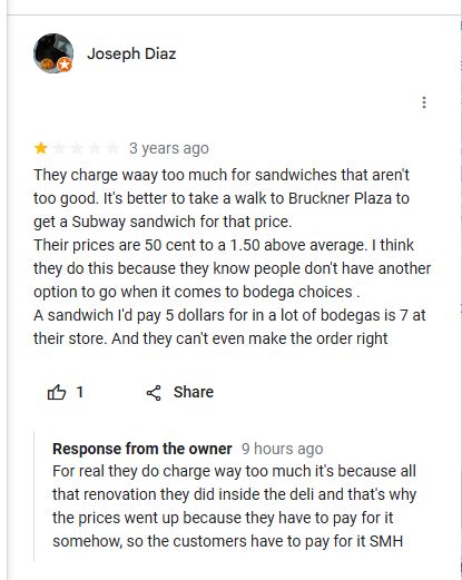 Read moreThey charge waay too much for sandwiches that aren't too good. It's better to take a walk to Bruckner Plaza to get a Subway sandwich for that price. Their prices are 50 cent to a 1.50 above average. I think they do this because they know people don't have another option to go when it comes to bodega choices . A sandwich I'd pay 5 dollars for in a lot of bodegas is 7 at their store. And they can't even make...