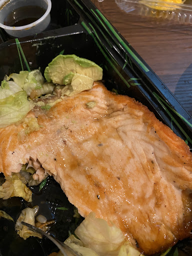 I ordered the teriyaki salmon bento box (9.25) (only 9.25 for salmon!!!) with shumai (a shrimp dumpling) and an edamame. instead of rice, I opted for extra salad, which was barely many leaves. thatâs my only con - I think they couldâve been a little more generous on the salad, considering it was in place of the rice.