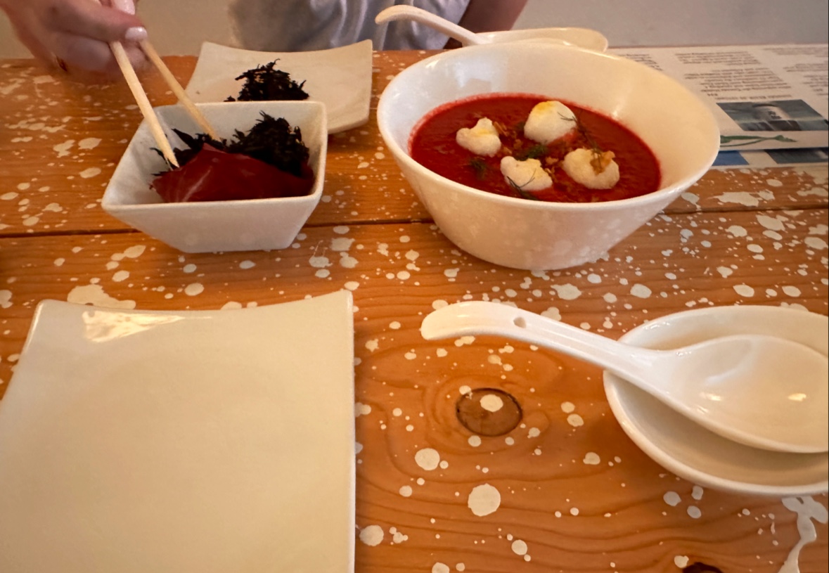 The food (we had the beet/cashew soup, hijiki, salmon app, beef app, shrimp app) were mostly good. The odd part was the beef and shrimp apps had a tomato sauce on them, which didn’t really work. Not bad, but just would not reorder those.