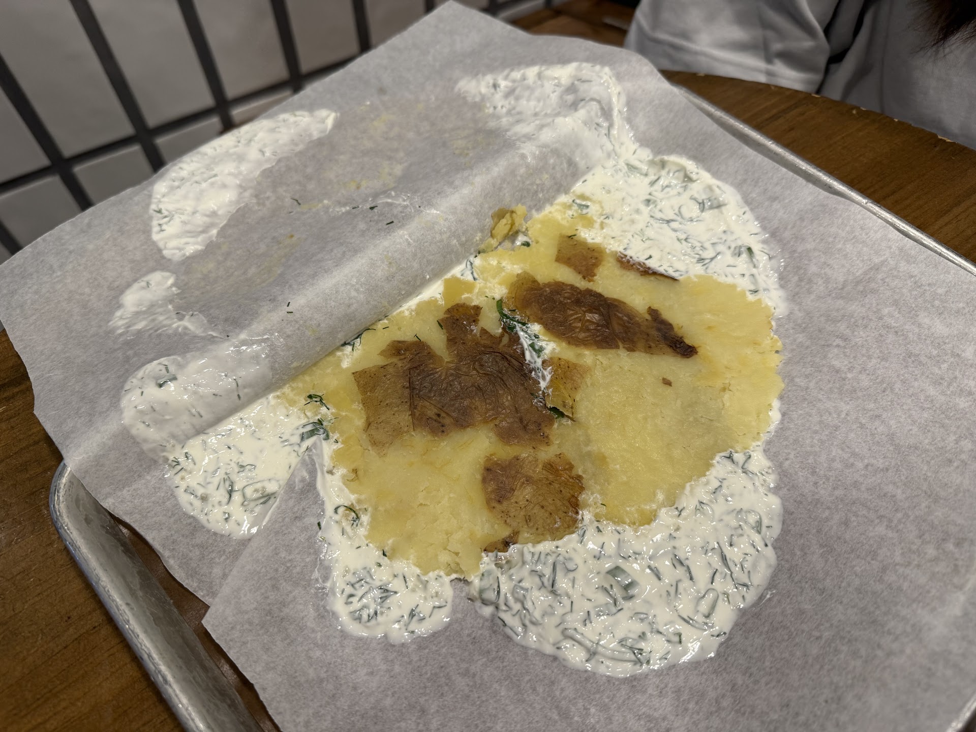 The potato was delicious! I love almost all shapes of potato and this was such a perfectly baked one. It was soft and fluffy, and came with a perfect amount of sour cream and butter with a lovely touch of scallions and garlic.