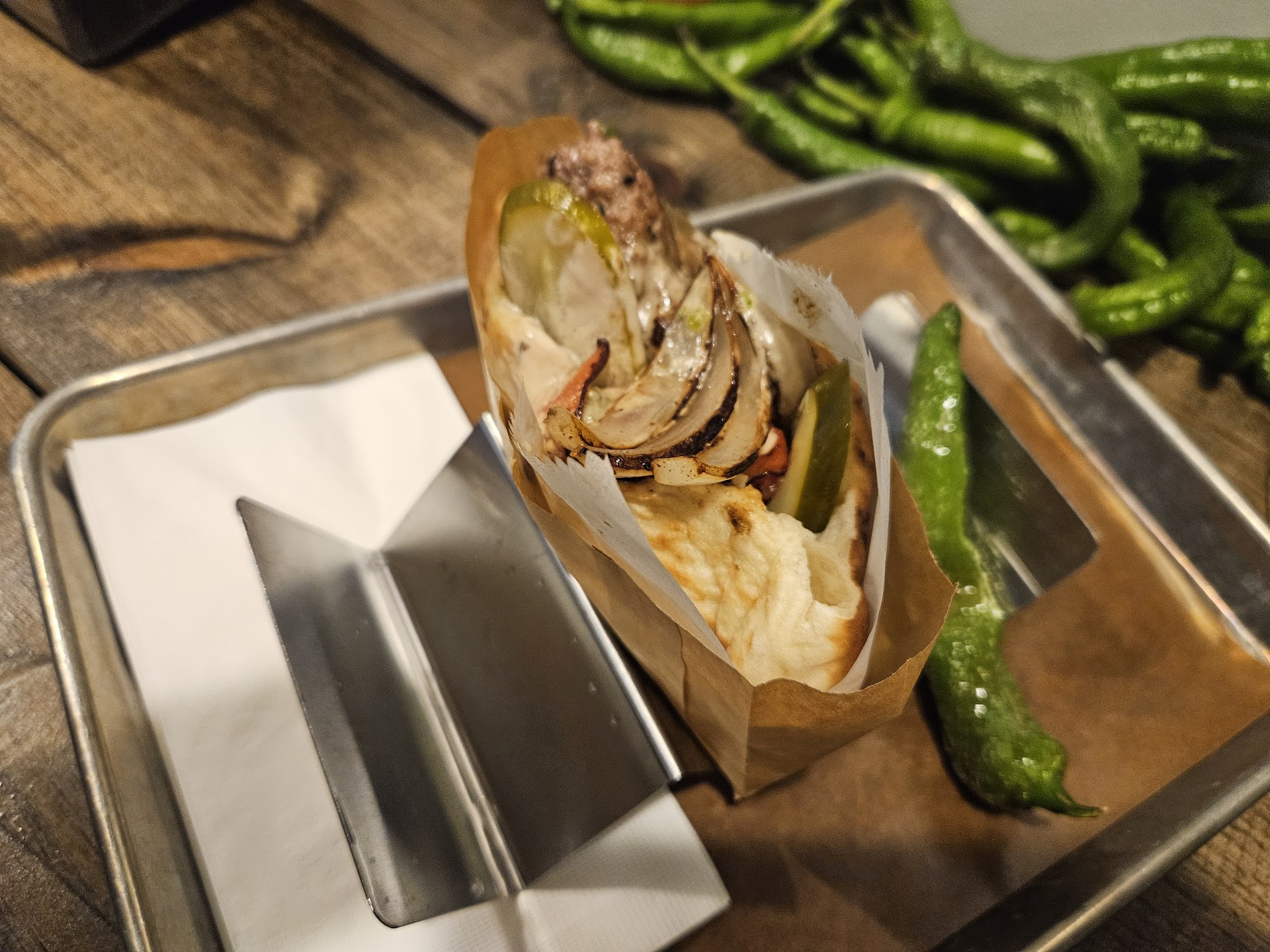 I asked the server what he recommended so I went with the lamb kebab pita. I was expecting a very generic experience and a very generic pita with the usual fixings. While I was waiting I was offered pita slices with tehina and schug which was extremely nice.