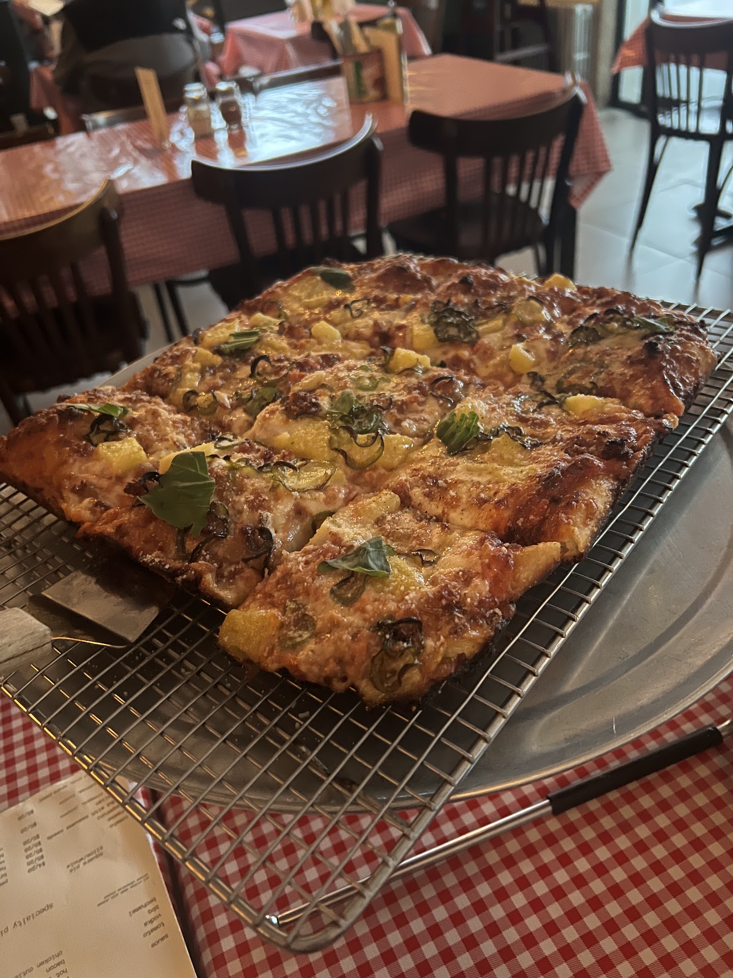 There are a good amount of options, which was lovely. I also appreciated that the single slice options (vs the personal pie options) are square, as I love a good square piece. We went with three: Hawaiian, white pizza, and pepperoni.