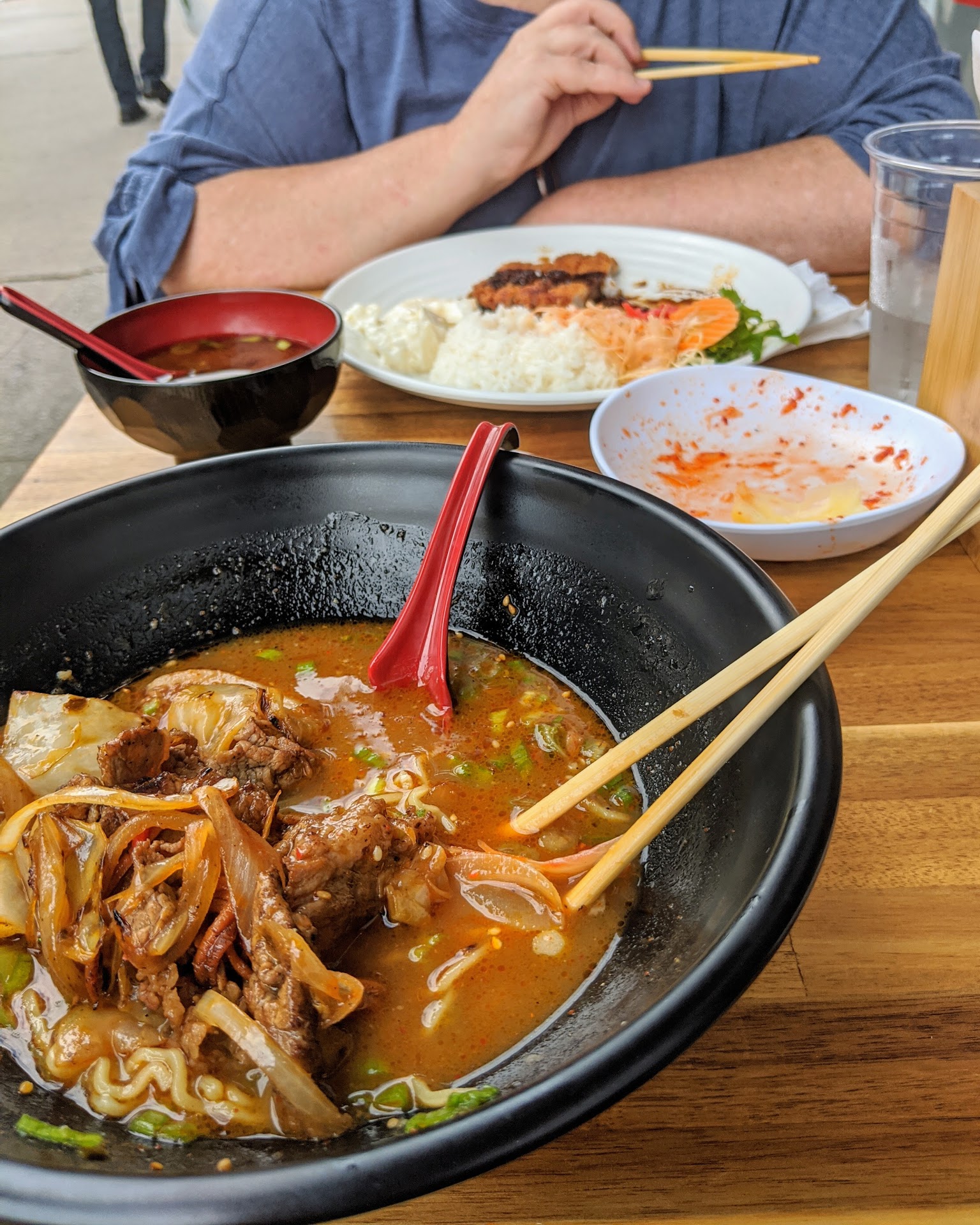 Food wise, I have always tried a different bowl of ramen, only hot, I haven't tried the cold noodles yet. The main bowls of ramen they serve comes with a Chicken broth, which is satisfying, although slightly less creamy then I like my chicken broth, it doesn't really leave me missing the creaminess, its flavorful and comes at just the right temperature for getting right into it. Very consistent soft-boiled egg. The different bowls of ramen are variations on the chicken broth, such as garlic, spicy, miso, or something with fish flavor I believe, either way, it's definitely worth asking the waiter whats going on unless you happen to read Japanese, which I do not. The thing that was recommended to me on my first visit by my waitress was the stir fried beef and vegetables, which comes out sizzling on a hot plate and goes great as a side to share with another person. I've always gotten ramen, the person I ate with always got a cutlet with rice, and we split the beef, which enhances their rice and enhances my ramen. Halfway through my noodley experience, I dump a portion of my stir fried beef into that bad boy to make it sweeter and savorier. epic flavor bomb. The kimchi is also fantastic, haven't had any that good that wasn't home made. The potato Croquet is also great, beautifully fried, but for the price I would probably opt for something else next time.