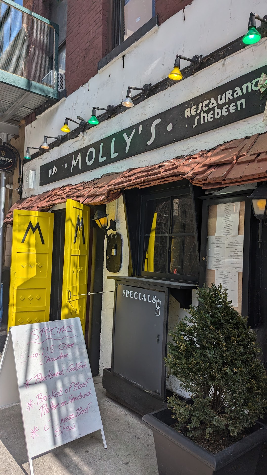 Read moreHoly "Hole in the Wall" Batman! Molly's is a cozy little pub offering drinks and food with an old worn out wooden bar top and booths carved into a small opening on 3rd Avenue. Serving up classic Guinness stout's there's just something about enjoying a Guinness so much more in an authentic Irish setting like Molly's! The food was just as authentic, our burger and special beef brisket sandwich with onions were both served up meeting high marks in all categories. The burger was cooked as ordered, filled the toasted bun with a thick, juicy, flavorful, nice cut of meat, lettuce onion and tomato, too. The special brisket sandwich, also nice and tender, juicy, in a tasty gravy smothered in onions and piled on a toasted ciabatta bread, so delish! The onion rings cooked perfect and the accompanying curry sauce was a pleasant surprise to dip French fries into! Give Molly's credit for taking a basic dish and making it correctly in their own way, so you can enjoy right to the last bite. The lady serving(Aisling)was quite a marvel, she clearly knew what she was doing, serving up drinks at the bar and waiting tables too...only few in this business could do so smoothly and efficiently like her, almost without effort( others should watch and learn). You'll love the warm cozy atmosphere this place...