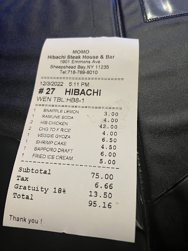 Read moreWhen we got there they seated us right away. Took our order when the chef came he had no personality. Very quiet. When I go to these places part of the reason I go there if for the show entertainment and the food. The presentation he was just going through the motions and not talking. Very disappointed. Then he started cooking. First was the fried rice which was stale it tasted hard and like plastic. When the chef gave us the bowl of rice he automatically turned it upside down o. Our plates. Why? I like to keep my rice on the side . Then he gave us the steak. I asked for filet and don't think it was. It was very tough. I asked for it medium rare and it was well. Then the chicken was extremely overcooked. And then the vegetables I always ask for them well done and never had the time to ask .before I k new it he was just throwing it on our plated without even asking g if we want it. We never got our sales which they asked us about at the beginning. We order 2 appetizers and had to ask for them 3 times before we got them in the middle of the meal . I had to keep asking for water. The waitress never came over to ask if we needed anything or if everything was ok . I had to ask for my kids ice-cream. BUT WHEN IT WAS TI.E FOR THE BILL THAT CAME RIGHT AWAY AND THEY WAITED FOR THE PAYMENT. they were not busy and there was plenty of empty tables. I now know why. Horrible food horrible customer service. Total...