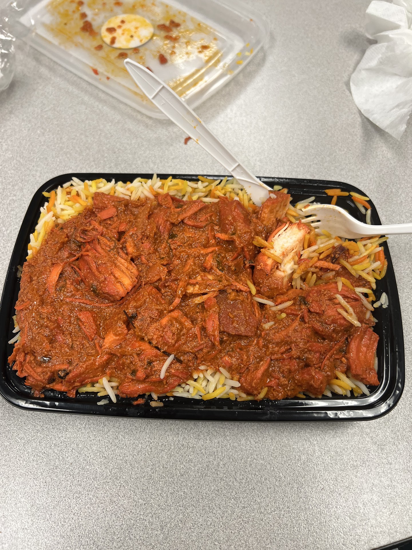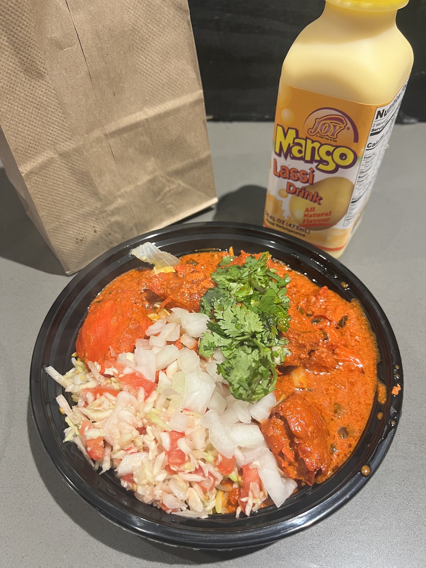 The staff member gave me the plastic contained and they didnât have bags to take it in, which was odd seeing as how the meal is curry based and leaks from plastic containers. She said it was her first day and doesnât know where the bags are.