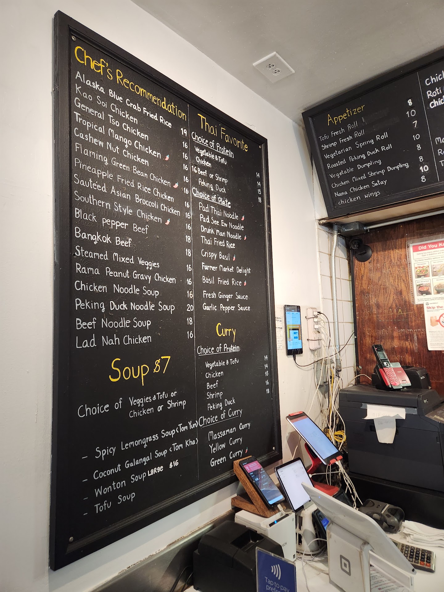Absolutely the worst Thai restaurant in Manhattan! For the price of what the menu items are you'd think an entree of curry would not come in a small soup container and it did not have any vegetables as listed in the description only a few bamboo shoots and shrimp. Also ordered the duck rolls which in the picture showed 4 looking like a decent size but instead received only 2 small rolls for $10!! So not worth the price!! My soup wasnt even filled to the top of container missing almost a quarter of it and it was flavorless, one of the worst tom kha soups ive ever had. They do not follow the special instructions, I asked for a side of Sriracha sauce with each item and only received one plus I said no rice and asked for veggies instead but still received it the rice. My order was placed at 5:30pm and I waited almost an hour and a half for the biggest disappointment. It did not arrive until 6:55pm. No way it should take that long for 3 items especially when it said it'd be delivered in 40-50 minutes. DO NOT ORDER OR EAT HERE! So many better Thai options in the area like Little Basil, Sabia or One Two Thai even Jaiya which is more pricey but a good sit...