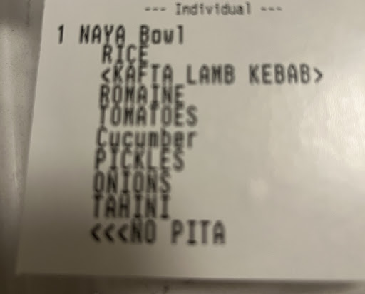 Read moreI’ve seen people say this place is better than Cava so I thought I’d try it out. Let me just say, it is not better than Cava at all. This is my second time ordering from them. First time they delivered my food 30 minutes before the scheduled delivery time which caused my food to sit outside my door for 30 minutes because I wasn’t home. This time they messed up my order. I ordered what you see on the receipt and I didn’t get any cucumbers but what I did get was hummus even though I clearly didn’t ask for that. What if I was allergic to hummus? It takes an extra .02 seconds to read the order properly before making the food. Also, the lamb meatballs were hard, tough, and overcooked. Hard to chew. Cavas meatballs are much better and Cava in general is better...