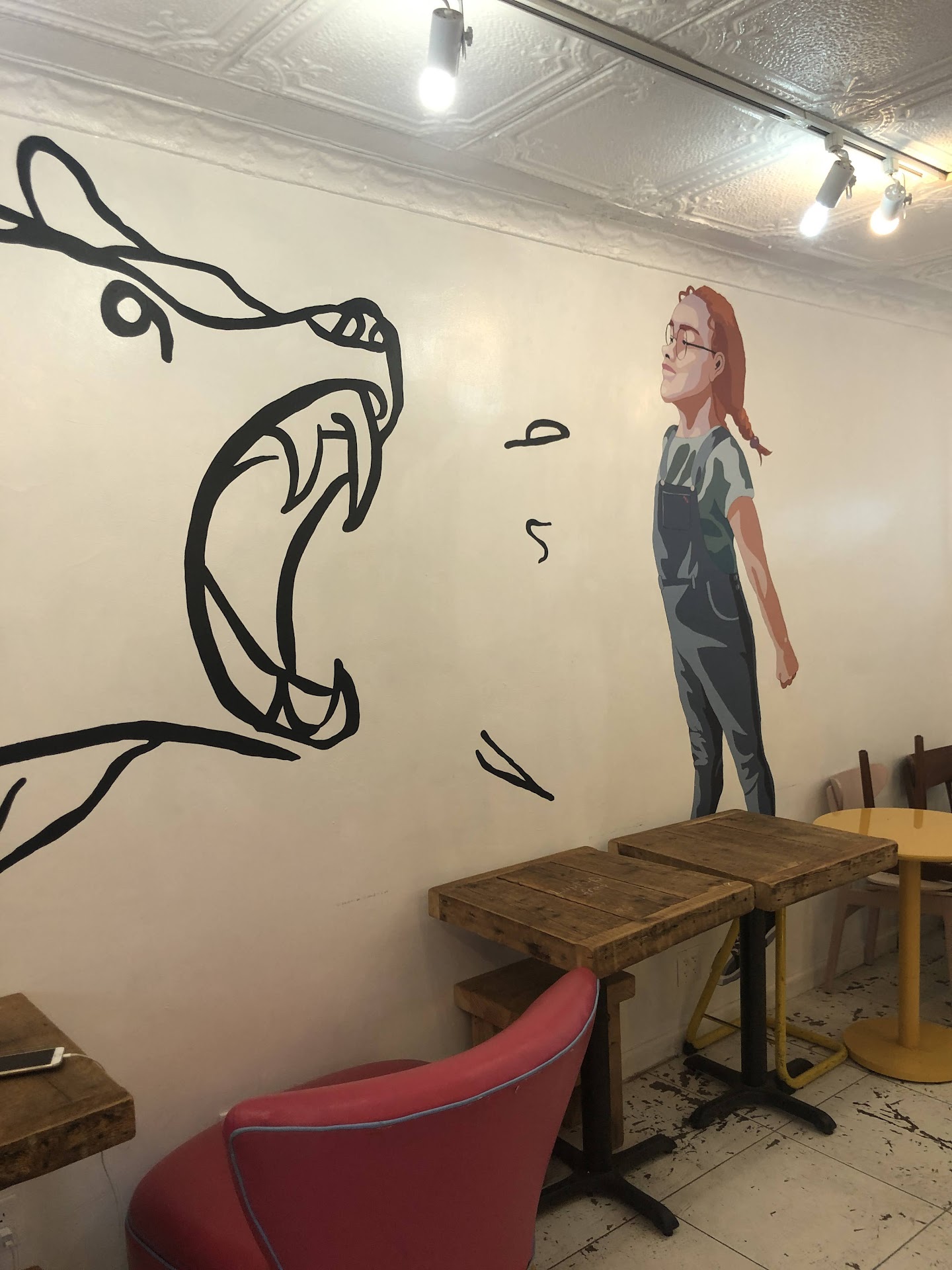 This cafe is all around beautiful, filled with delicious art/decor and I love the general celebration of all things nerd. The atmosphere is uplifting, inviting, and just plain beautiful. The staff is just excellent. Great seating, clean comfortable, and charming side street in Park Slope. 5+ stars ... if there were a restroom.