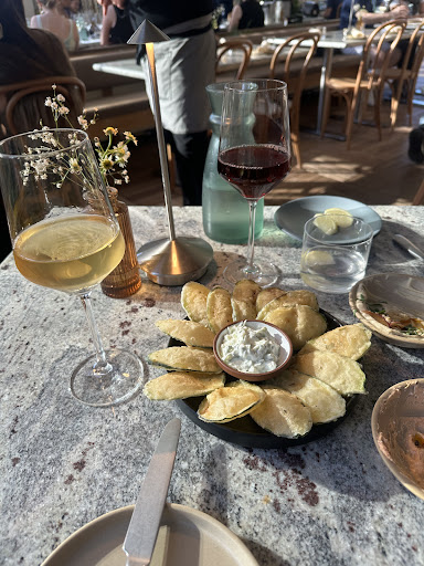 We finally made it to Nerina, and it immediately felt like something brand new for Greenpoint. Just a five-minute walk from our apartment, it’s easily one of the most elegant restaurants in the neighborhood—right up there with Ilis, Oxomoco, and maybe Madre. But where those lean into their own vibes, Nerina confidently carves out its own lane: upscale Greek, with a focus on thoughtful detail and a real sense of place.
