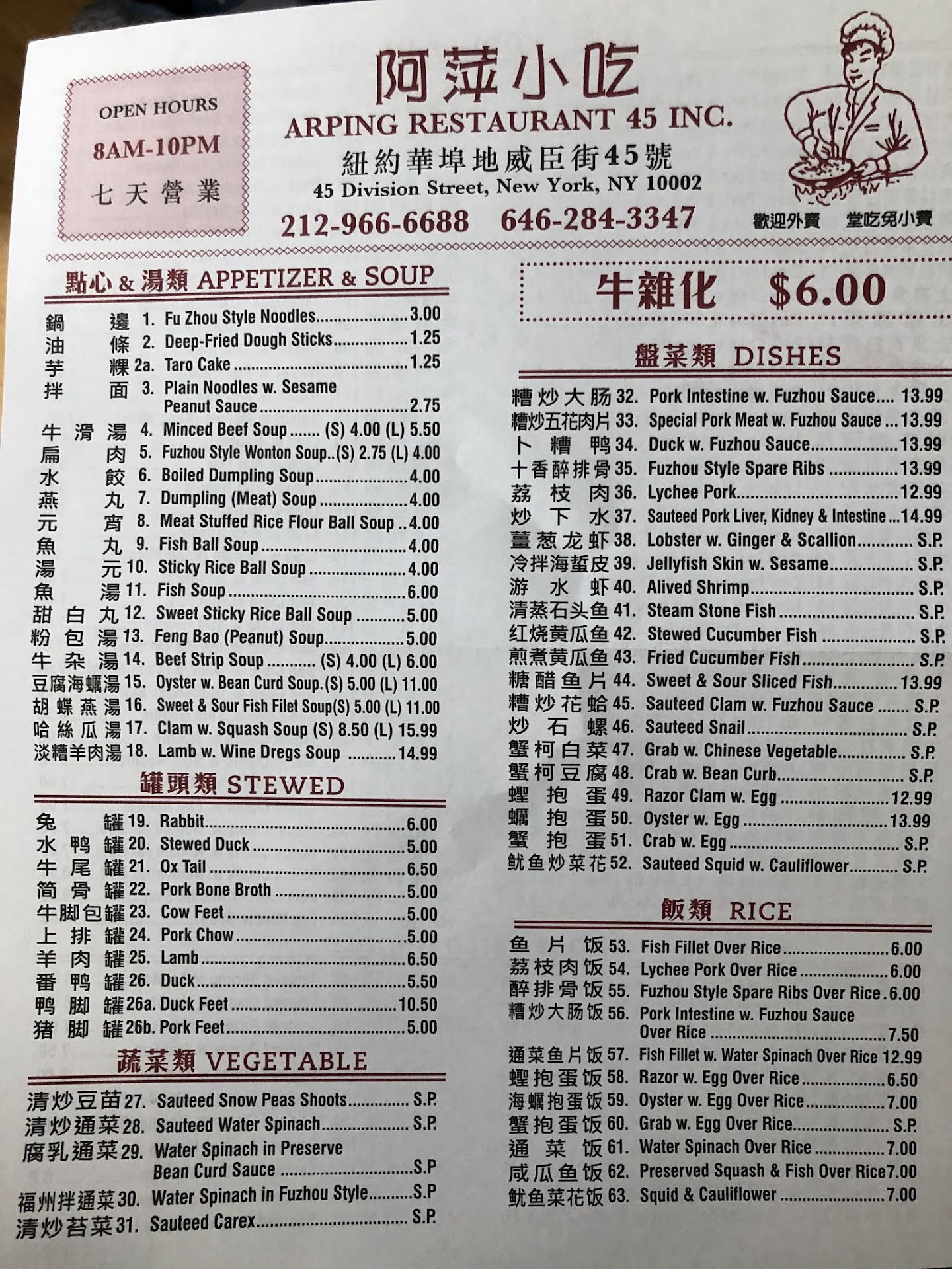 Read moreVery authentic Fuzhou comfort food served in basic settings. Everything is served in dsiposable plates or cups, but everything we have tried is so delicious! The stir fried snow pea shoots were very tender and full of flavor. Fish ball soup was piping hot and had about ten fish balls (for only $3). The Fuzhou style spare ribs were deep fried with chunks of taro in a sweet and sour sauce. The veggies in the pork fried rice noodles ($5) were just a tad bitter, which was perfect for the dish. For sure this food has more subtle flavor than say sichuan cuisine, but still outstanding in its own...