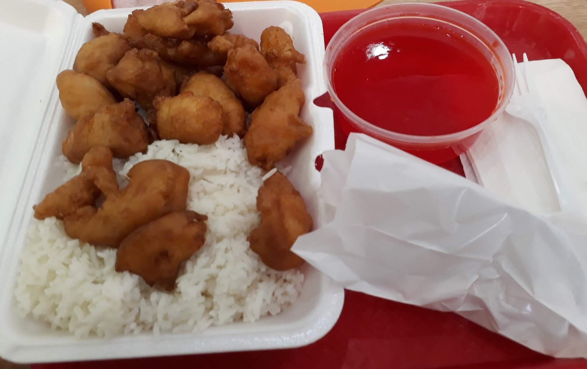 I went there for lunch just because the Thai resto I went to initially was closed & ordered sweet & sour chicken. It was my 1st time there & I didn't know one of the dishes so I asked the lady who was taking my order. However, she answered me rudely. I told her that she shouldn't be mad because the reason why I asked her because I was clueless about that particular menu; otherwise I wouldn't ask. I was supposed to just back out after that but I was already hungry so I just proceeded & just ended up ordering sweet & sour chicken (at least this dish I knew). To my surprised, the chicken didnt look like sweet & sour chic at all. It didnt come with any veggies (bell pepper, pineapple, carrots etc.); but instead, it came with a pink sauce that looked so artificially colored & I didn't even dare to taste it cuz it looked inedible too! I told the lady about it that it didn't looked like sweet & sour but it's just like chicken nuggets but she just answered me that that's how they do it! The chicken tasted alright & crunchy but I don't think I will ever come back to eat there again ever. Also didnt like the fact that they are serving hot food in a styrofoam. Imagine the chemicals that might mix with your food when it's piping hot. I saw they serve the takeaway in a carton box (which is the thing I like) but why can't they do the same for dine in? The other thing I like is the comfortable seats they have.