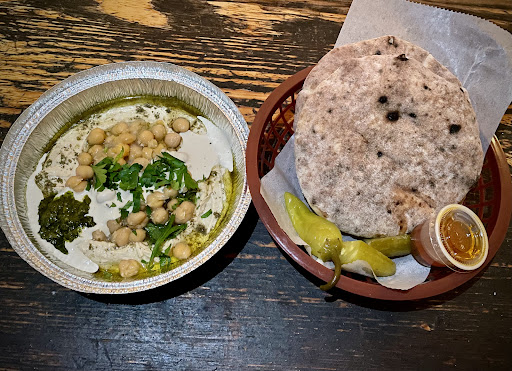 Masabacha Hummus with 2 pita pockets: All the ingredients in this dish-- tahini, chickpeas, spices, and s'hug-- provided such a delicious combination of textures and flavors when mixed together: earthy flavors combined with creamy and gritty textures. The pita pockets were also warm and soft. Super filling and tasty!