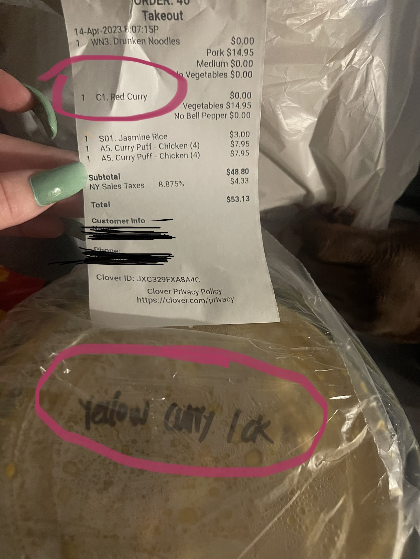 I ordered dinner over the phone and spoke with the woman who usually takes the orders. She repeated everything correctly. In my order I ordered red curry, now when I get home I received yellow curry. When I called to complain they were closed so I left a message on the vm. Next day I still didn’t receive a call back in response to my vm. I spoke with the same woman to right the wrong and she became irate like I did something to her, I asked to speak to the manager at first she said he wasn’t there then he magically appeared. When I asked his name he said it didnt matter just that he was the manager. So supposedly he refunded my money, I guess I have to wait a few days, but the whole experience has left me with a sour taste. My warning to everyone is to check your food before you leave, things get ugly when it’s...