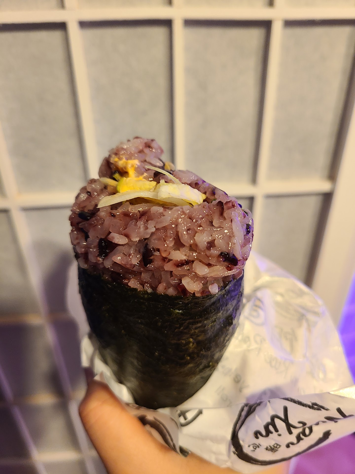 The roll comes with sticky purple rice, which was made to a very good consistency, being softer but chewy. The nori was completely soft by now. The black pepper flavor was not fragrant but you can taste it at least. There were also some green onions, lettuce, and a little bit of pickled vegetable. Overall, it was filling enough, but the flavor was very lacking. Very little of the beef had any beefy flavor due to there being more vegetables, and the black pepper was also very weak. The roll itself was bursting with rice, which isn't necessarily a bad thing. It was a bit messy, but they gave plenty of napkins.