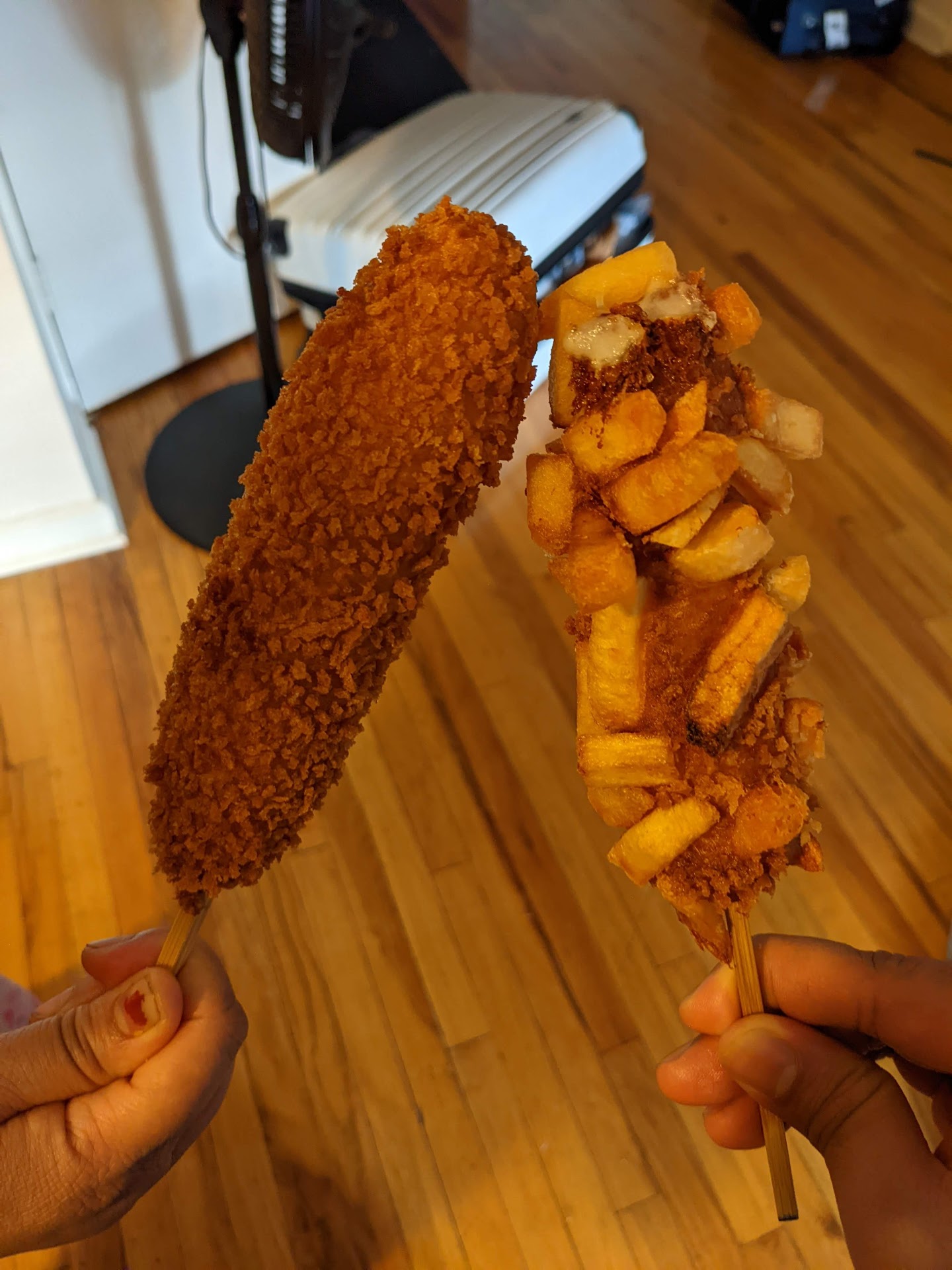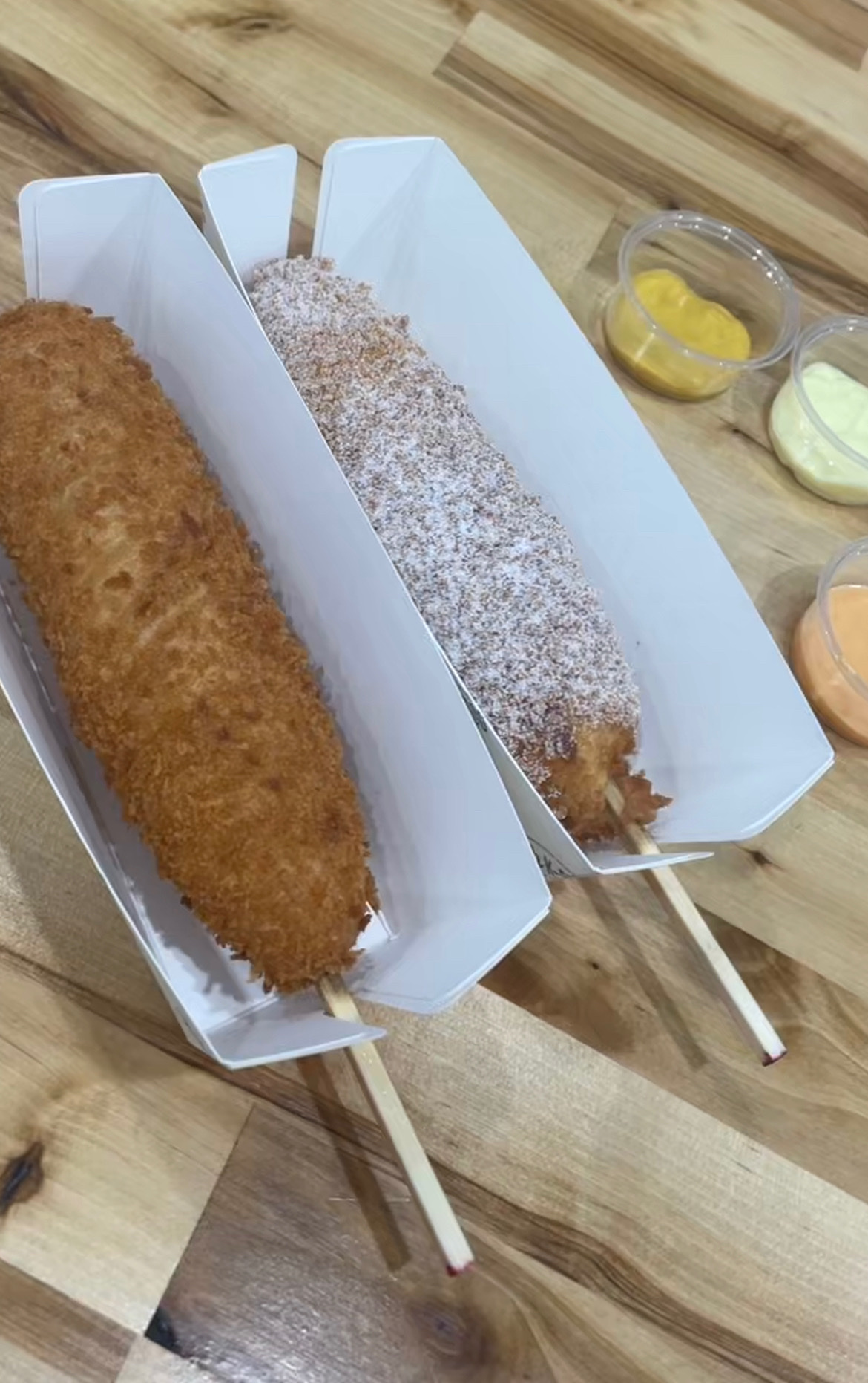 Batter too heavy. Regular hotdogs are tastier imo. The potato mozz dog barely had any mozzarella cheese and by potato, they meant fries on the batter outside. Wish they called it fries mozz dog instead. Not sure what to do with the sugars.
