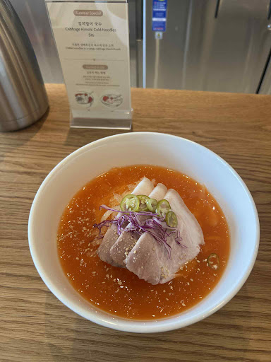 The kimchi cold noodles (kimchi-mari guksu) were made with cabbage, according to the menu. The broth was refreshing and quite good, but the flavor and aroma of the kimchi were milder compared to more typical versions of this dish. The overall balance was nice, so those new to this type of dish might enjoy it, but if youโre expecting that tangy, fizzy kick from the kimchi, you might find it a bit underwhelming. I personally enjoyed it still.