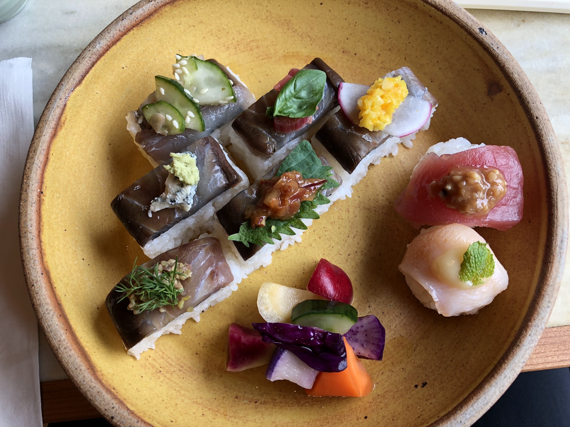 Read moreI liked it but I probably wouldn't make the trek back; however if you've never had Kyoto style sushi or if you live nearby I'd say it's worth checking out. The prix fixe menu has three different price points: $25, $35, and $45. All three share the fish broth, the picked vegetables, six sushi pieces of the same fish and two pieces of what is essentially nigiri. The $35 option gets additional hand rolls and the $45 option gets additional hand rolls and sashimi. I had the $45 set but I think the real value is in getting the $25 option as I didn't find the hand rolls or the sashimi that compelling. The highlights of the meal are the "nigiri" and the broth; the sushi is decent but it leaves you ultimately wondering whether you'd rather not eat different types of fish rather than eat the same one seasoned...