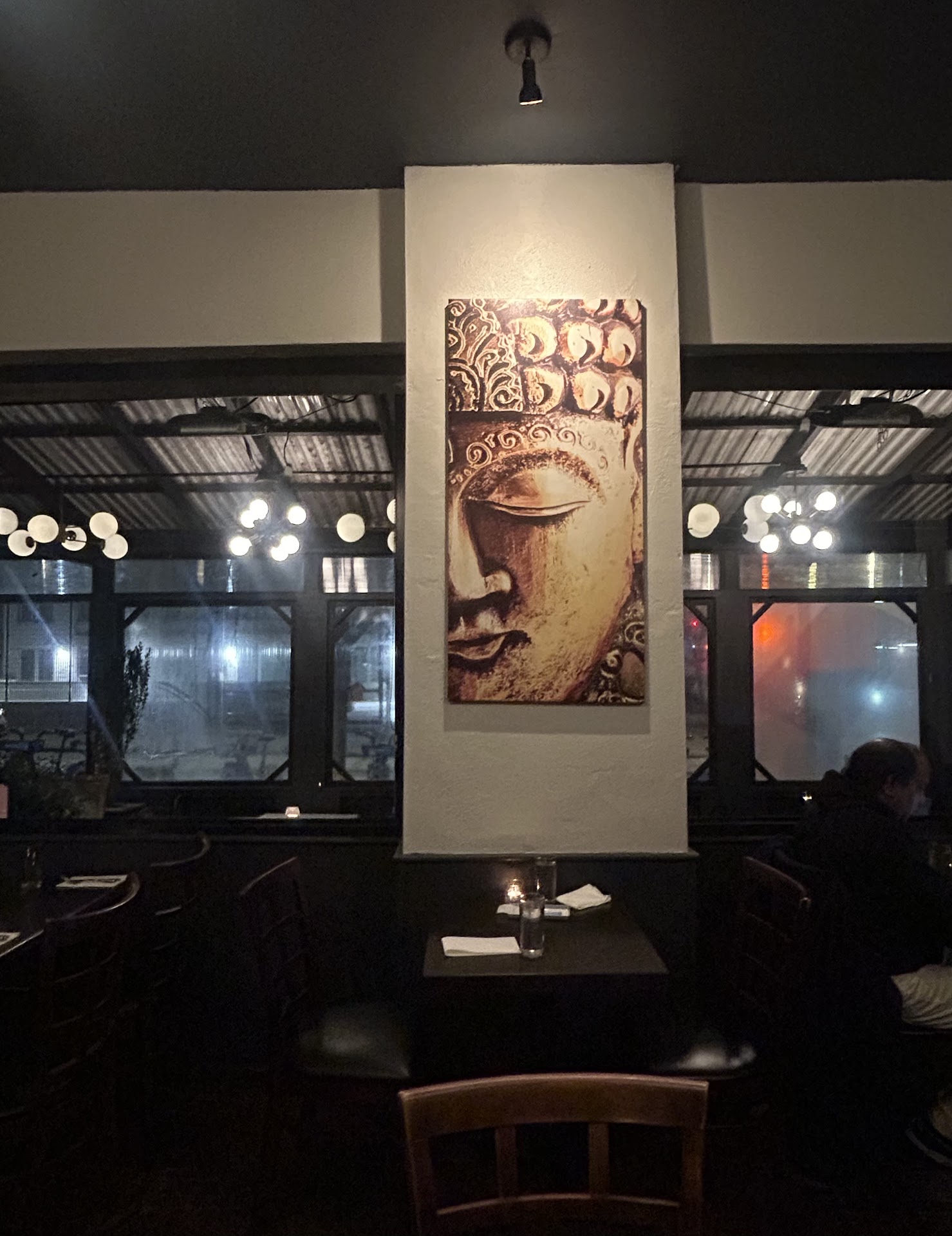 I went here for dinner tonight to enjoy the restaurant, and especially the very peaceful outdoor seating area during an unseasonably warm Saturday evening. We were greeted first by a host, and then by Ricky, a server who has always been so upbeat and energetic making the meals even more enjoyable. He spoke very sincerely about the joys of serving the local York Avenue community who comprise the main demographic of the restaurant's patrons, which includes my boyfriend and myself. The service is always very good, with an attentive water server always prepared to fill glasses during spicy Indian meals. The cheap cocktails are a fun start to the dinner, as are the complementary Papadam lentil crackers which are served with a mixture of coriander and tamarind chutney. I always order either the chicken and goat curries with carefully curated spices with the seeds clearly being lightly fried in oil, followed by the stew making process, which not all Indian restaurants take the time and effort to do anymore. I find that the meat dishes pair perfectly with the lightly buttered garlic naan. I also usually really enjoy the Chana Saag with the chick peas slow cooked in the greens and they truly taking on the flavor of the simmered vegetables. The saag is also chopped, not pulverized as it is often found at other Indian restaurants. Today I ordered something off of my usual, and I was disappointed. The Vegetable Korma included a strange assortment of vegetables which included red and green peppers as well as canned pineapple chunks which added an interesting addition, in only the truest sense of the word. I would highly recommend OM, for the food and the service, but I would also recommend that they stick to the more traditional dishes which are expected at this type of...