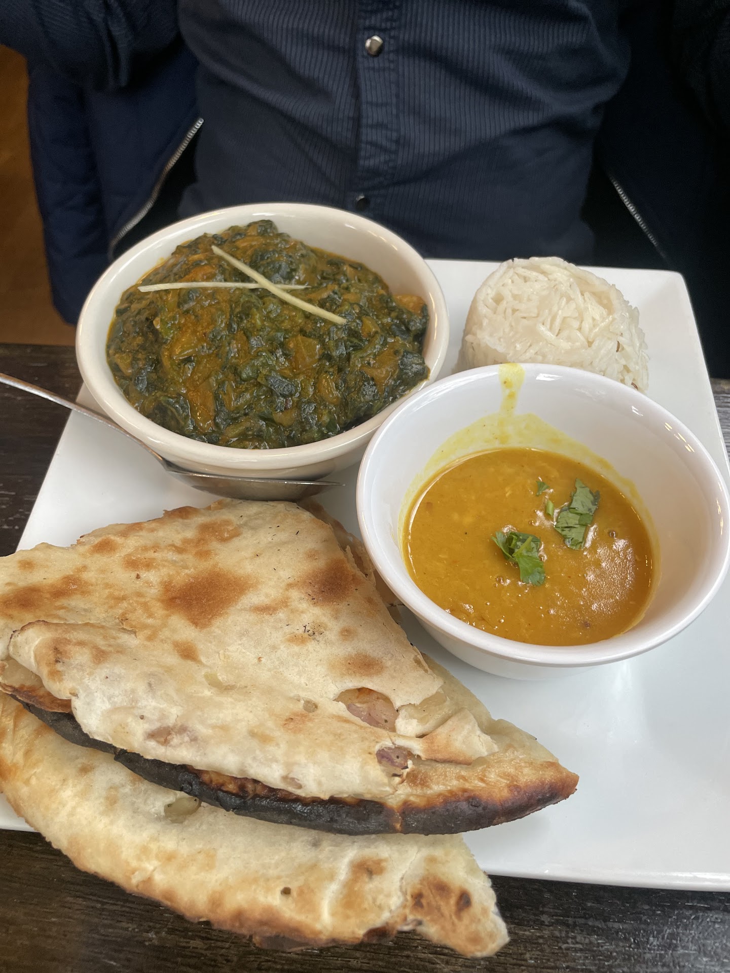 As our main course: I got the OM Daal and it was delicious. The lentils were perfectly cooked and not soggy and the daal was well seasoned. I also really liked the balance of spices. The second entree we got was the Saag Aloo. This dish was also really nice and well seasoned. They did a great job blending the two. The dal of the day was a tadka yellow dal, it tasted like a nice home cooked dal. The naan came out fresh and was a big portion size and they gave a small serving of rice.