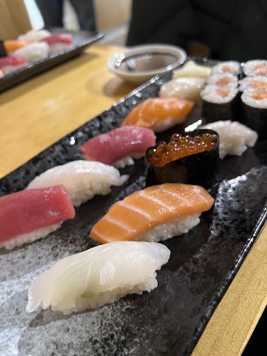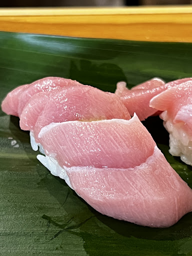 Read moreYou come here for the food and that’s it. It’s a very intimate space. Probably room for 12-15 at the counter and a few tables for maybe I’m guessing 12 other diners. Small. There’s no way to avoid eye contact with the chefs which is kind of cool. I would say the sushi is average and not particularly creative. Not sure if the omikase is more creative. I snuck a brief peek and think perhaps it may be (more creative) but uncertain. The otoro bluefin tuna had an unusual texture different from what I’ve had before…see picture. It didn’t seem to be as buttery as fatty tuna I’ve had at other sushi houses. I missed that. The Japanese uni wasn’t as fresh TASTING as I’m accustomed to. Usually you have that sense of tasting the ocean and sweetness… and the richness fills your mouth with that delightful sensation. This was missing in mine although the portion was generous. The menu has a variety of fish I had never heard of before. I tried the pricey seared nodoguro. It is like the Dover sole of sushi…very rare to find this fish and bring to market per Google. Honestly, aside from the grill flavor, it wasn’t particularly a “WOW”. Very friendly staff but my empty water glass was overlooked multiple times. They serve the sushi on a banana leaf on the counter. Nice in theory but my pieces toppled on the uneven leaf. Some of the uni fell off...