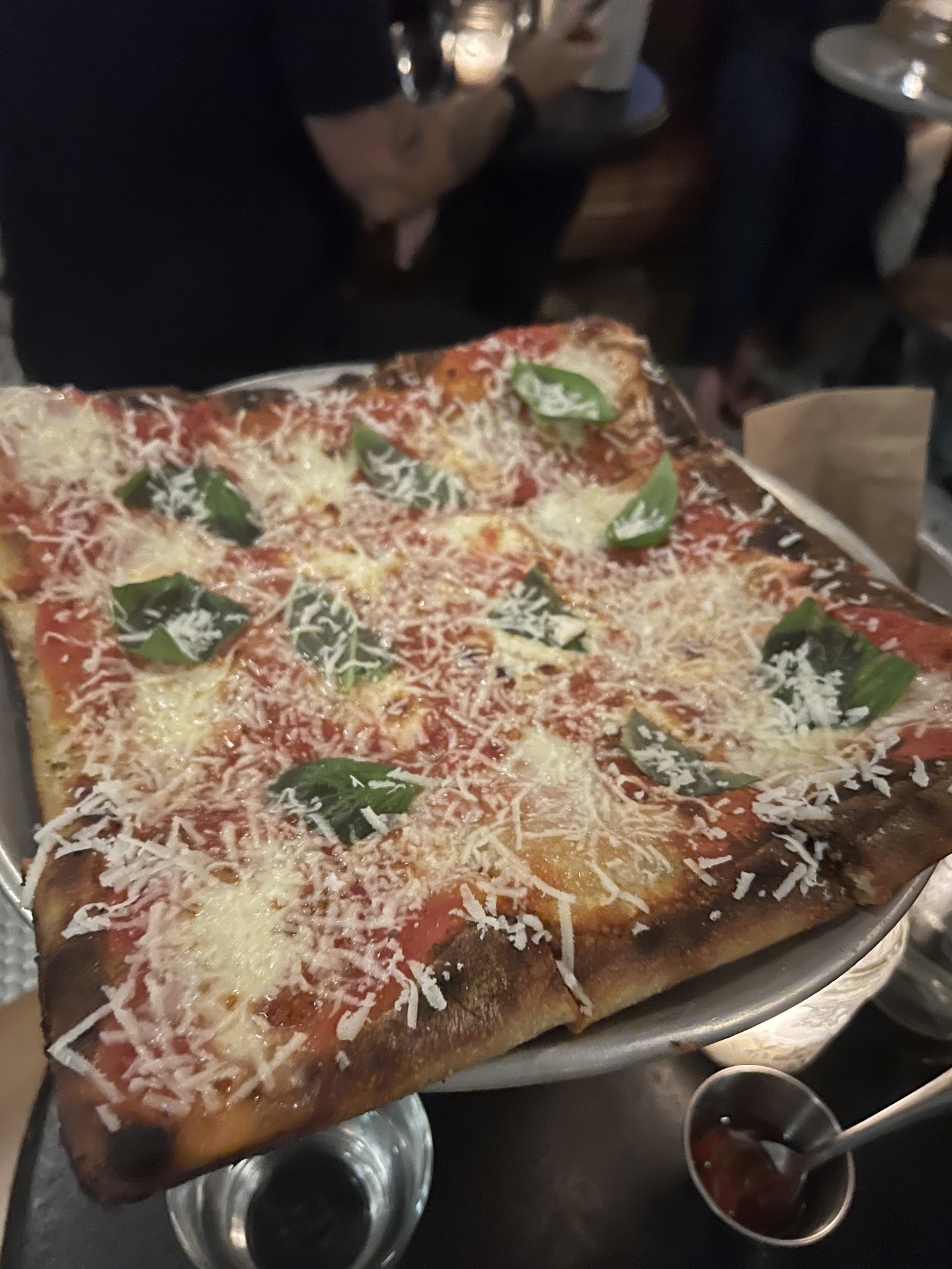 The size of it wasn't terrible, but it was shorter than your average slice - thing of a typical NYC slice, and cut about 2 1/2 inches off from the crust side. That's about the size we were dealing with- something that we didn't feel quite justified the price, especially because it wasn't particularly mind-blowing.