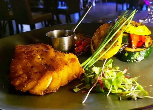 Chilean Sea Bass - Cooked to perfection! Lightly crunchy, delicately seasoned, soft, succulent texture inside. The seasoning didn't take away from the exceptional buttery taste of the seabass itself. Paired with the most delicious vegetables consisting of peppers and squash grilled and marinated with... I'm guessing soy, teriyaki and an Asian wine to perfection. This was an exceptional dish!