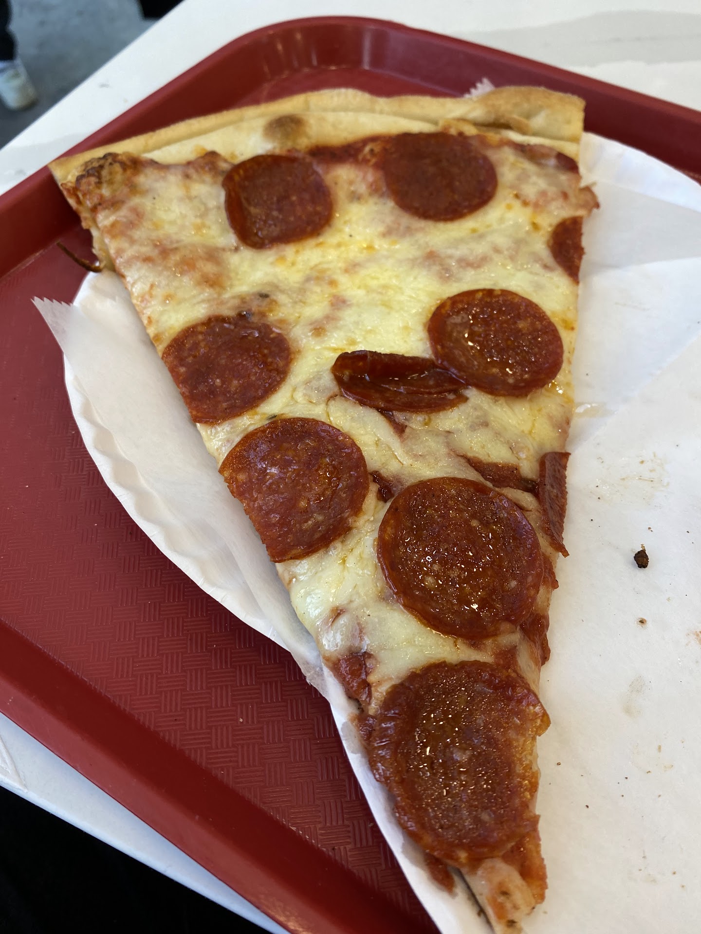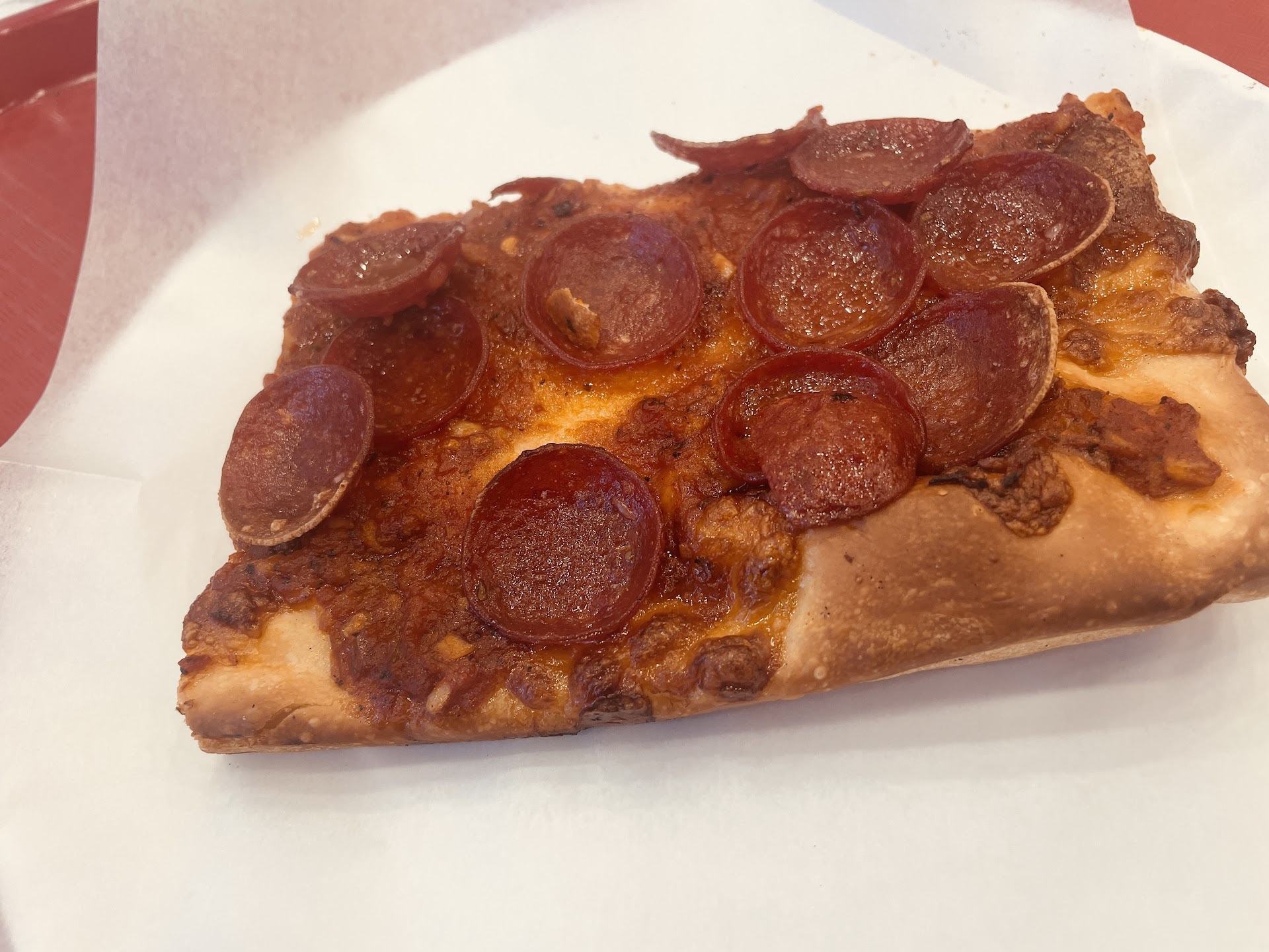 The sauce on the regular slice either had too sweet tomatoes, or added sugar - the sweetness of the sauce takes away from the salt. The crust wasn’t crispy, but was of fair thinness.