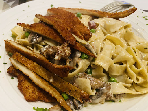 Now the entrees! The salmon Wellington was SO GOOD! The puff pastry was crisp and paired perfectly with the salmon and the dill cream sauce! It was a special but totally worth trying if you see it available! Our carbonara came out extra Al dente, then when they tried to remedy it it ended up being overly watery and just as Al dente. However, Walter was friendly and open about the experience, where he did everything to make sure we enjoyed our experience. The fresh fettuccini that Walter recommended was so delicious and came out mild in flavor so we could adjust it to our liking with cheese, salt and black pepper.