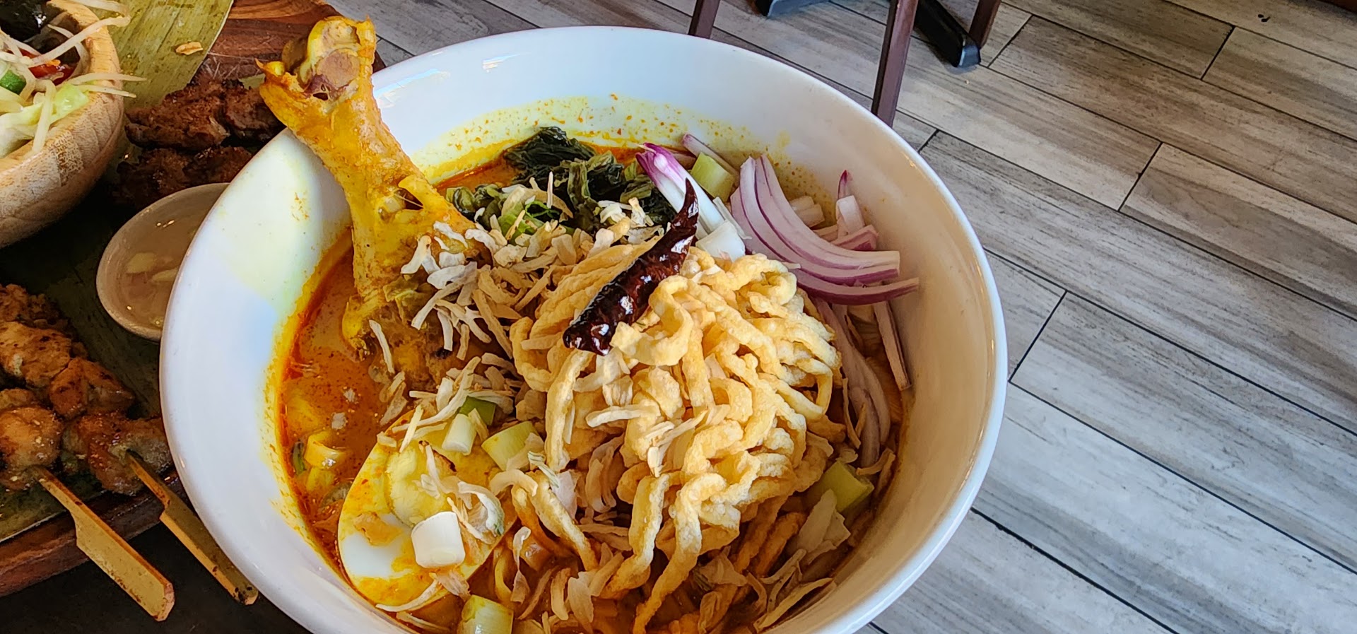 Khao Soi thick egg noodles half fried in yellow curry with a kick. So far this is my favorite.. spicy, curry, and thick noodles.