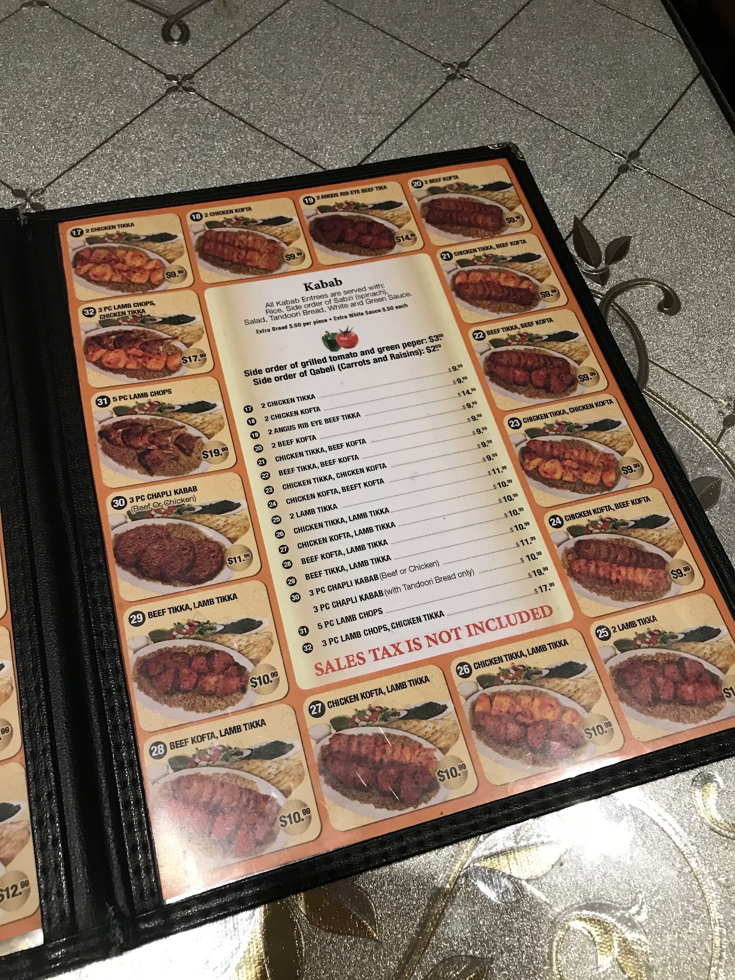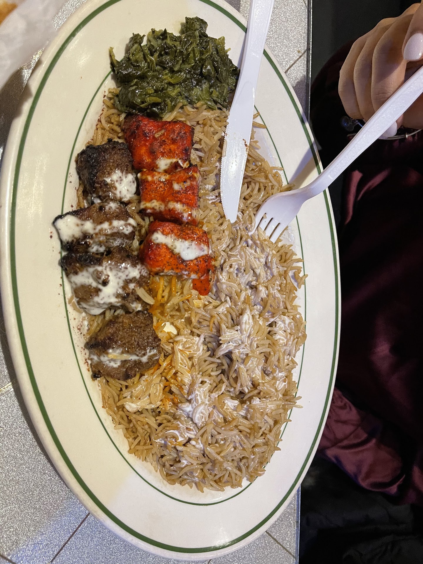 The chicken chapli round kebab was great, loved the texture and softness of the patty. (5/5) Was served with with rice, creamy spinach, and a side salad (lettuce, tomato, cucumber and purple onion)(5/5) 3 patties with the sides for $12
