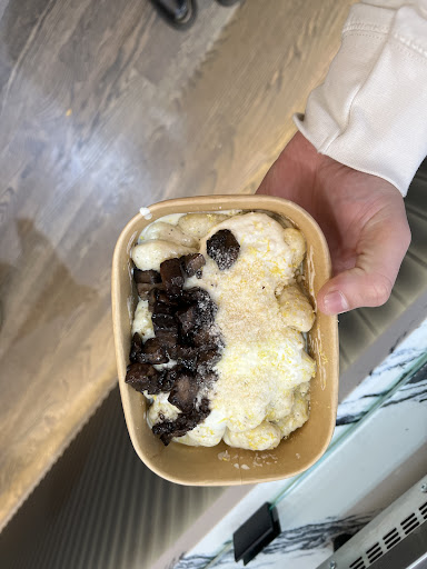 I added mozzarella, mushrooms, and sun dried tomatoes to my chicken alfredo gnocchi bowl. Today was rainy; there are outdoor seats.