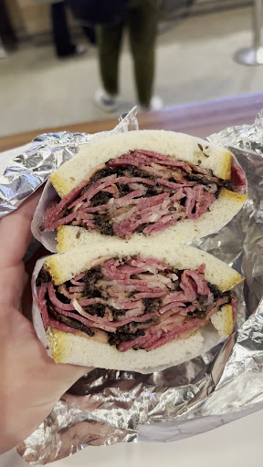 -Service was great and friendly. This is New York F*'in City 𤣠so things may be a little more fast and busy than some tourists might be used to, but as an experienced New York City visitor, I found the girl who took my order was very helpful and friendly. The pastrami on rye was great. The bread was moist and fresh, the pastrami has a great spice and was very lean (I didn't even order extra lean, don't need it), a good amount of meat for the price, and it comes with a nice juicy pickle. The chicken matzoh ball soup was the star, flavorful with lots of noodles and the matzoh ball was a perfect texture. It came out super hot and fresh. The price is a good value for New York City. Everything is generally expensive here. The giant stuffed sandwich from that other big name place costs twice as much, FYI. The soup was full to the top and the sandwich did not skimp on the...