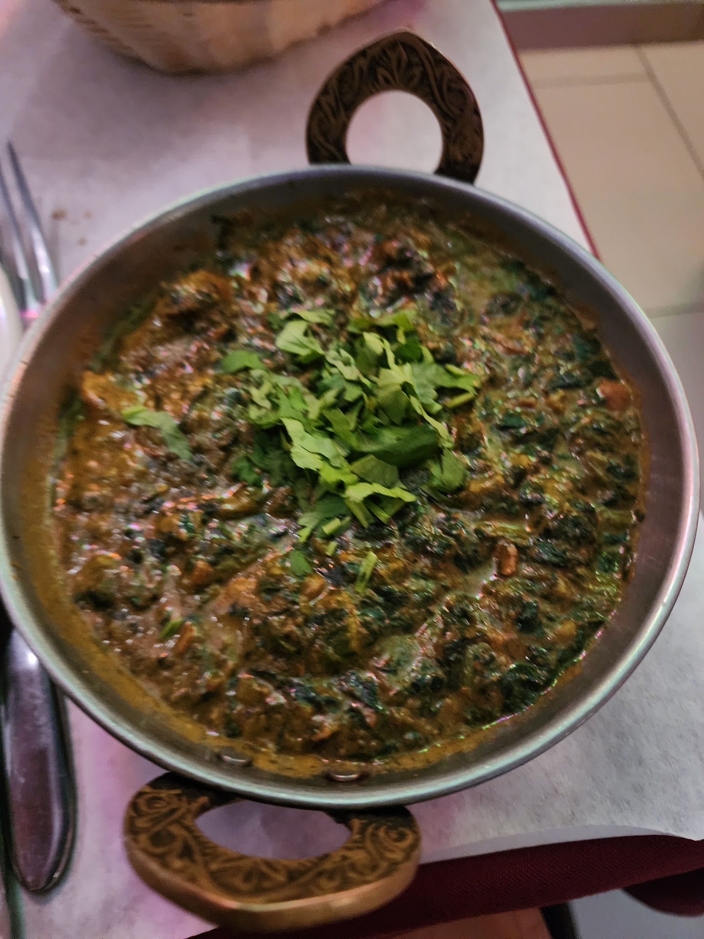 The food unfortunately, wasn't the best. The samosas on this occasion were overcooked 150% (so, dark brown, very hard, and not even slightly flakey), the "thimbles" of sauce were no where near enough for three samosas (FYI, ask for extra). The food (sag aloo, and an eggplant dish) were fine, portion-wise, but honestly both were pretty bland. Needed more salt and flavor in general. The rice was oily, but had good flavor (bay leaves and cardamon pods). The portions / value was really good, but again, the flavor was mediocre.